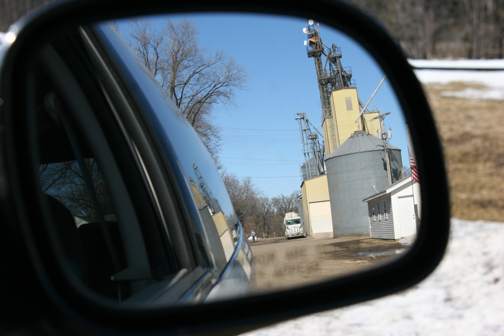 The grain complex in unincorporated Bixby in Aurora Township in Steele County, MN, reflects in the passenger side mirror.