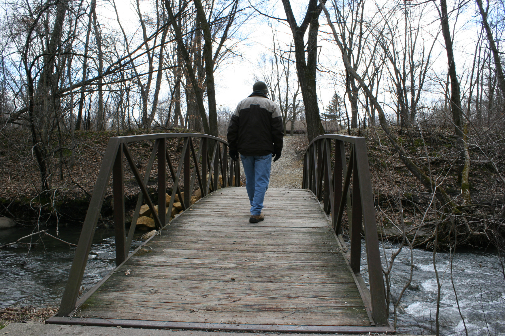 Here a dirt hiking path curves along the waterway winding through woods. Access to that path comes via an arched pedestrian bridge. There water rushes over rocks and we always pause to appreciate the soothing sound of rushing water.