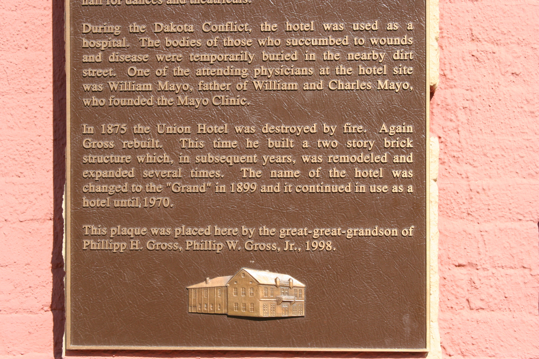 A portion of the historical plaque outlining the history of the former Grand Hotel, now an arts and cultural center in New Ulm.