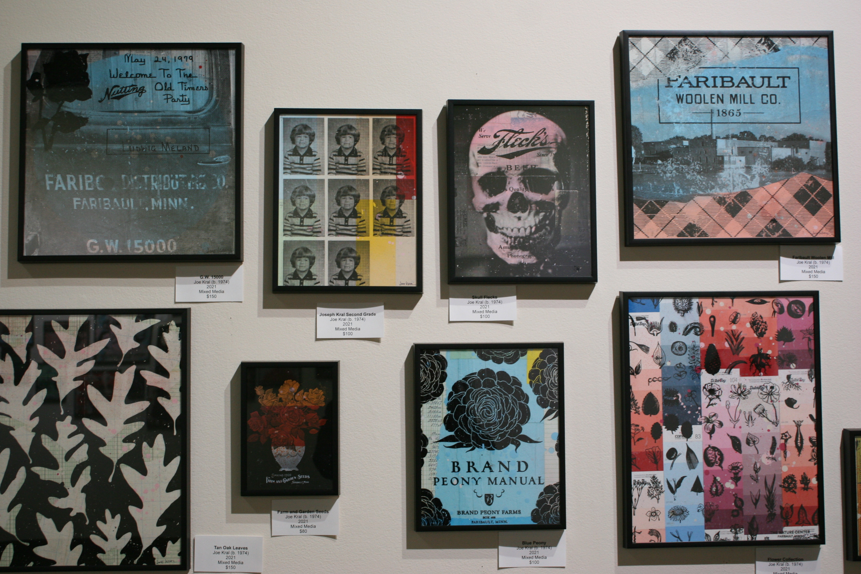 Faribault residents and natives, particularly, will feel like they are walking down memory lane when viewing “My Hometown.” Kral features primarily Faribault businesses. Like Brand Peony Farms, Fleck’s Beer, King Flour Mills, Farmer Seed & Nursery and Tilt-A-Whirl—all gone. But he also includes art on current businesses like the well-known Faribault Woolen Mill and KDHL radio.