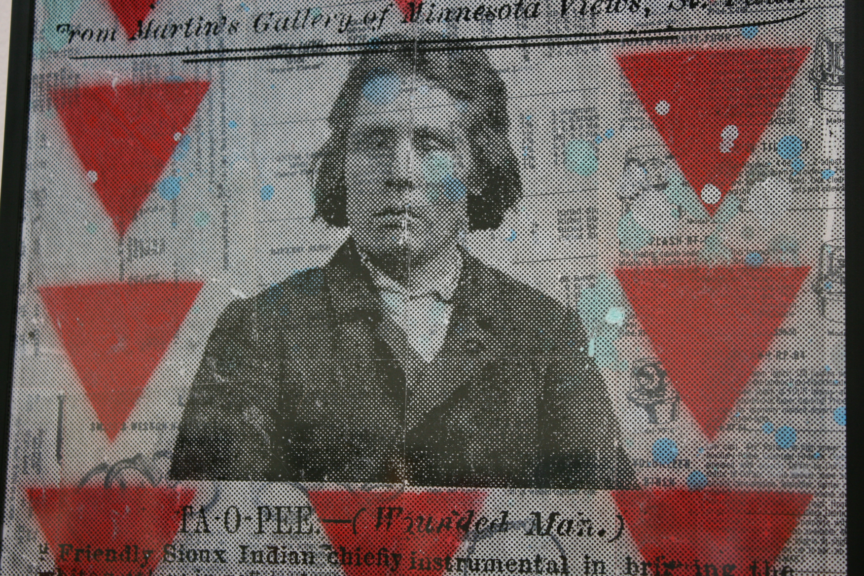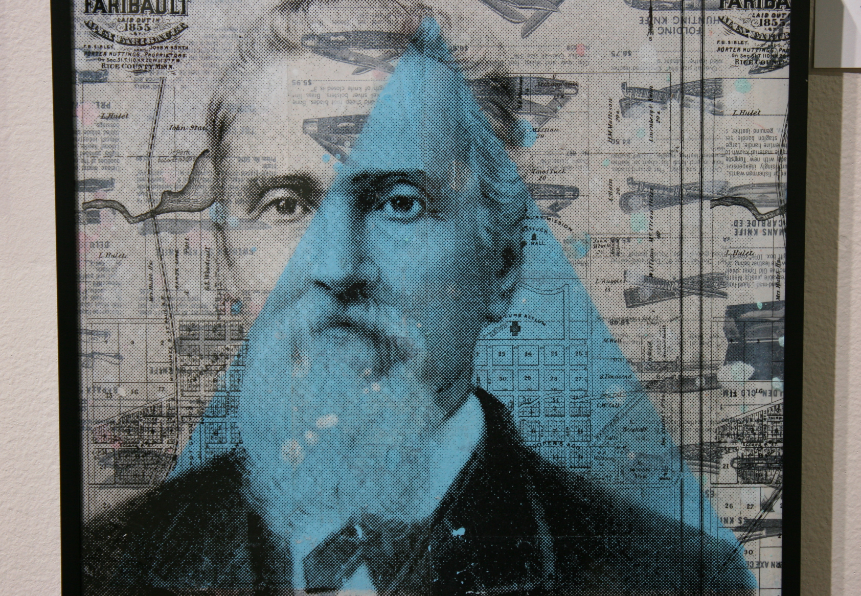 Town founder, Alexander Faribault, portrayed in Kral’s mixed media art.