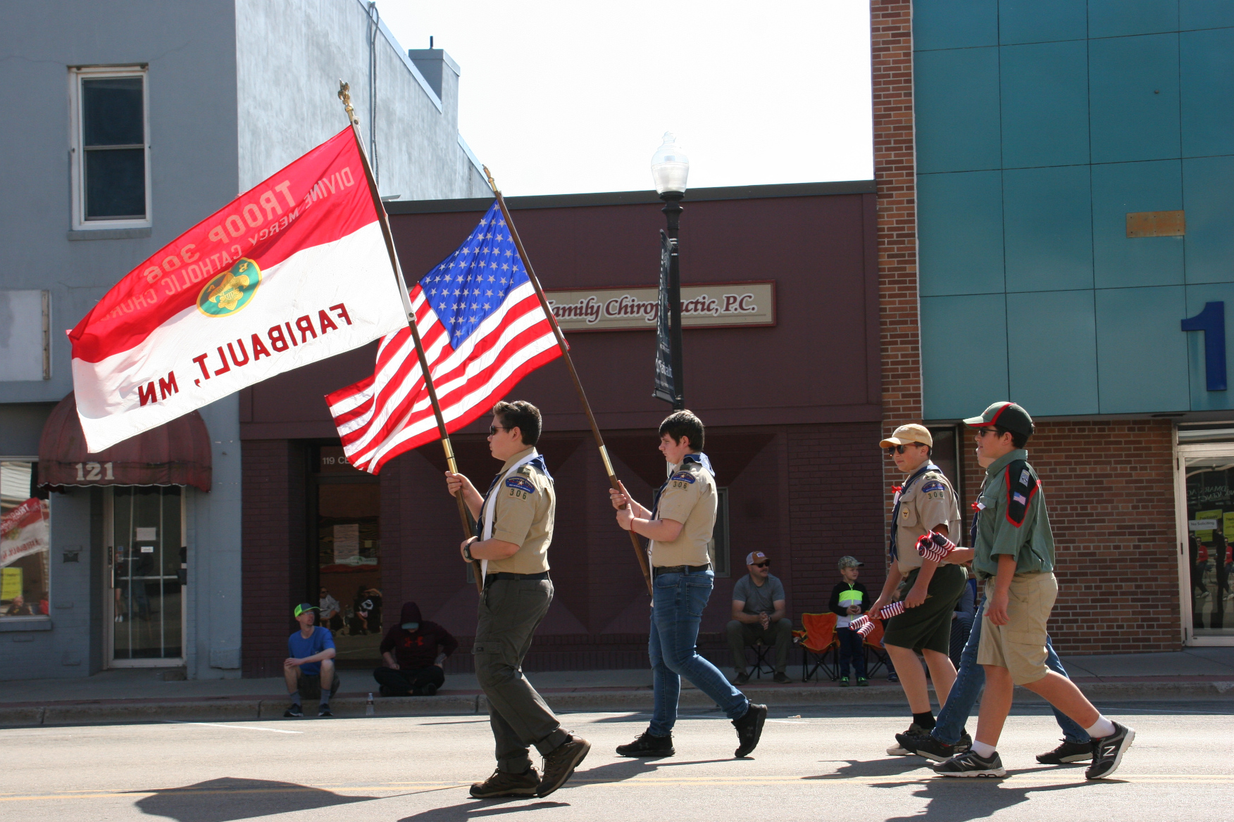 The Color Guard marches along Central Avenue past the many historic buildings which grace our downtown. Minnesota Prairie Roots copyrighted photo 2021.