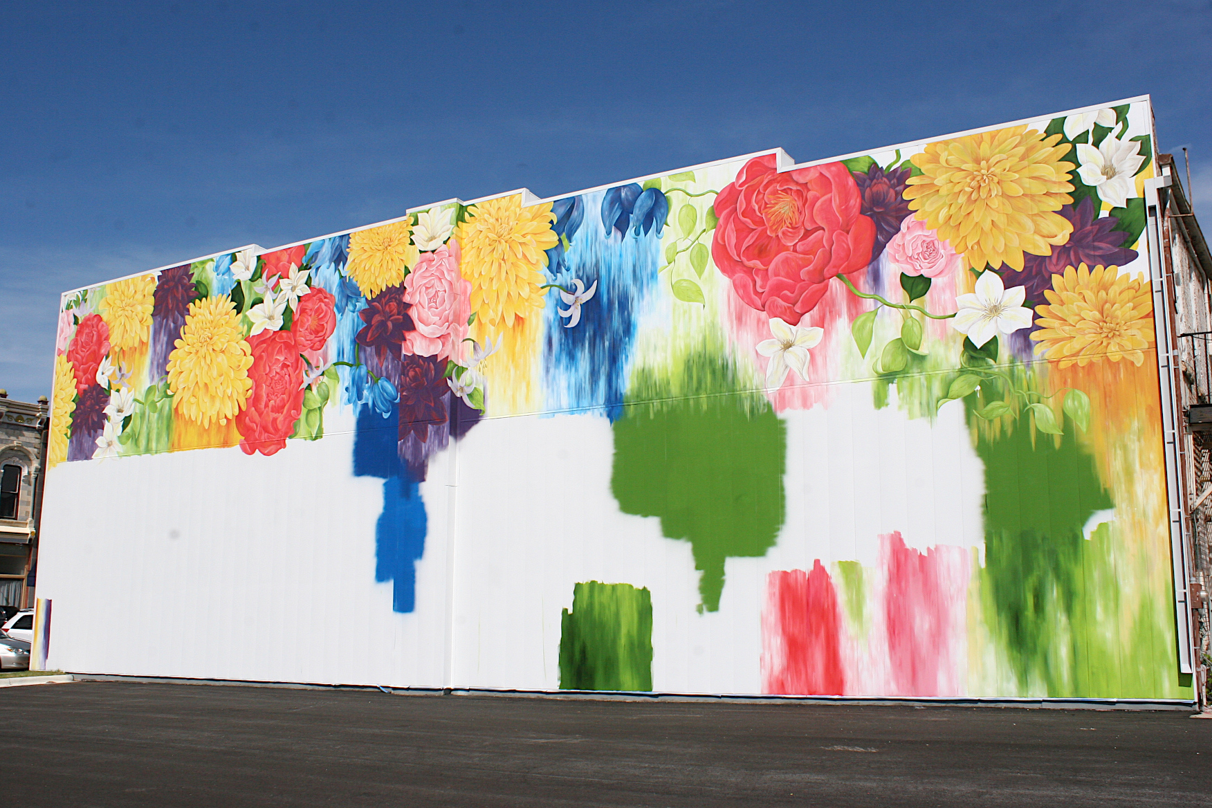 ART BLOOMS ON A MASSIVE white canvas, brightening a street corner in the heart of downtown Faribault with flowers in vibrant hues.