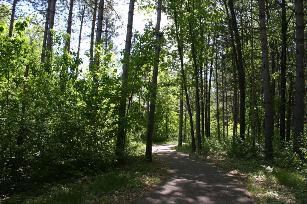 A trail winds through Mission Park near the cabin. Minnesota Prairie Roots copyrighted photo May 2021.