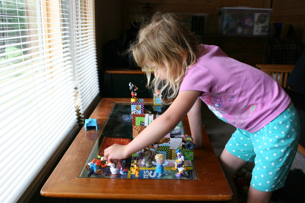 Izzy plays with figurines one morning at the cabin. Minnesota Prairie Roots copyrighted photo May 2021.