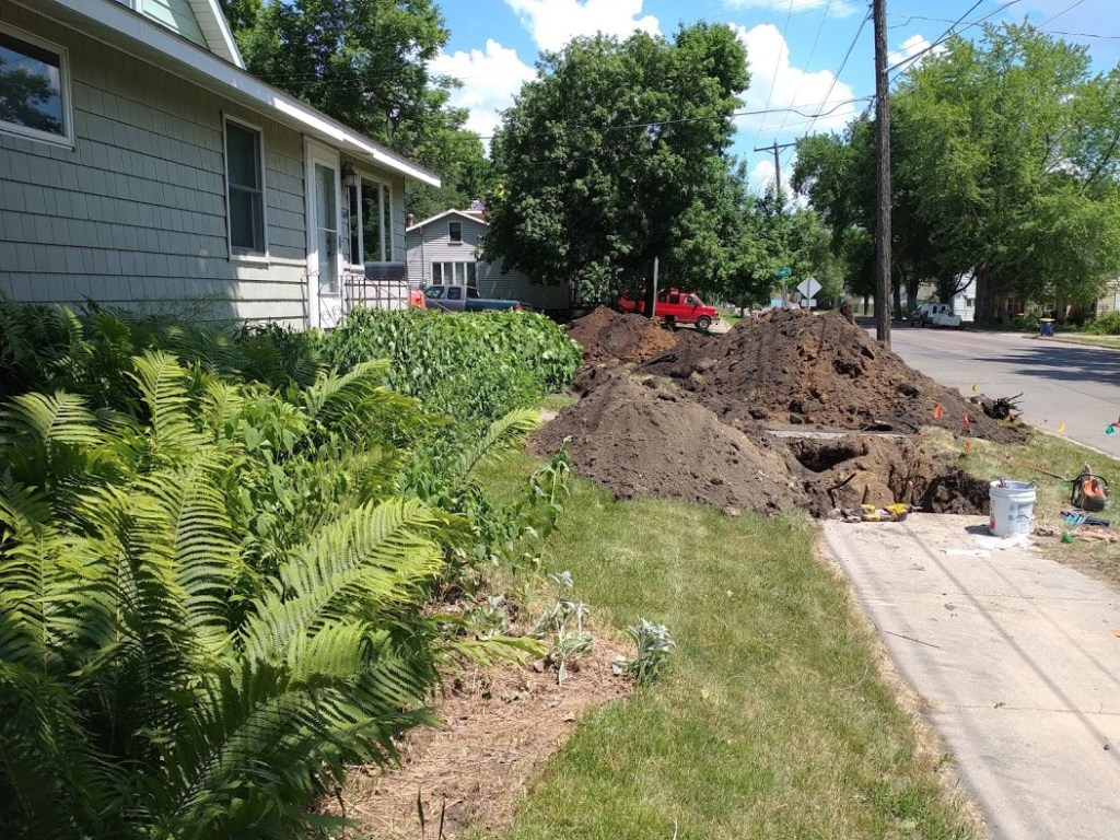 Two sections of sidewalk were removed to access the water connection, leaving part of our front yard and boulevard dug up. The sidewalk has since been replaced. MN Prairie Roots copyrighted photo.