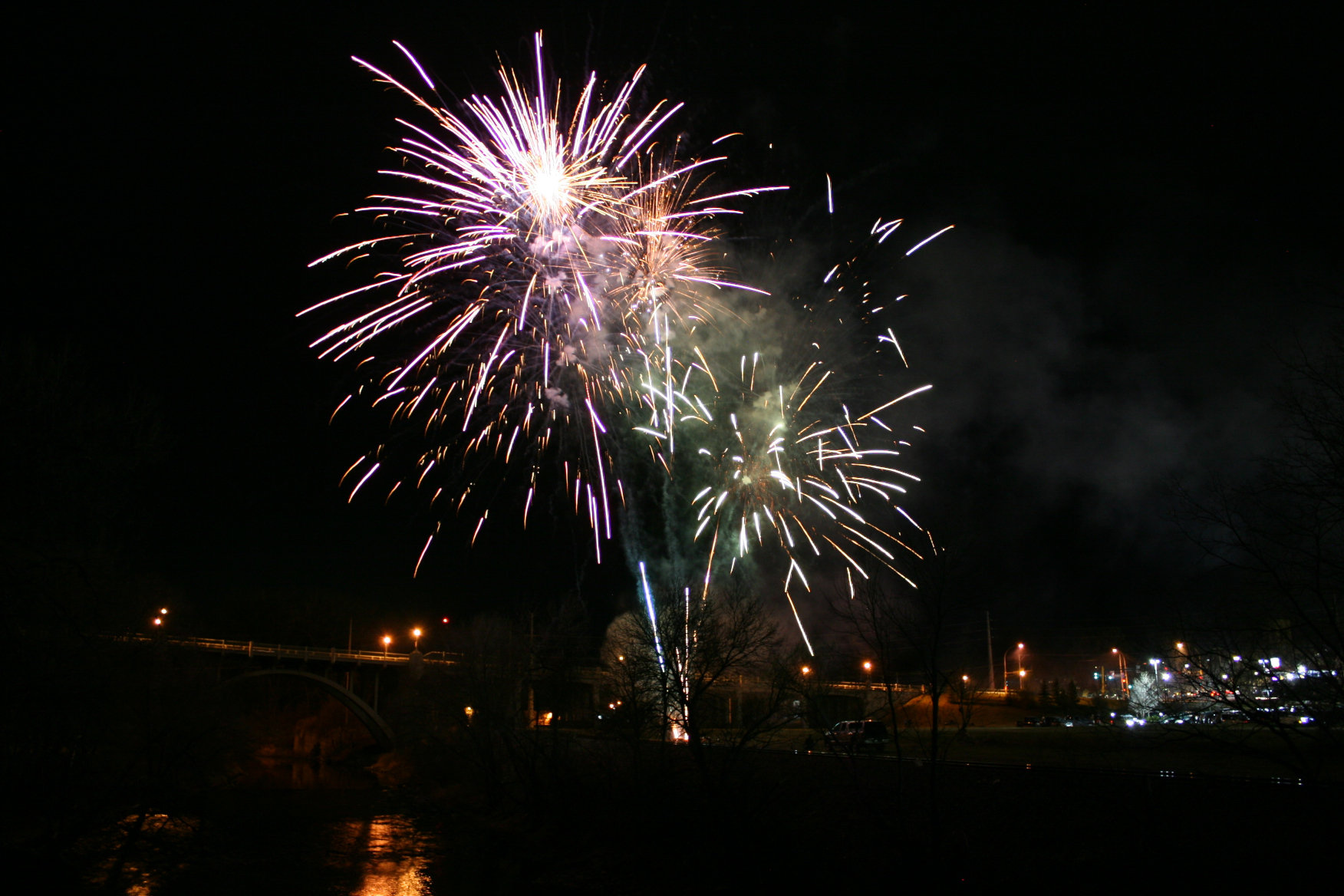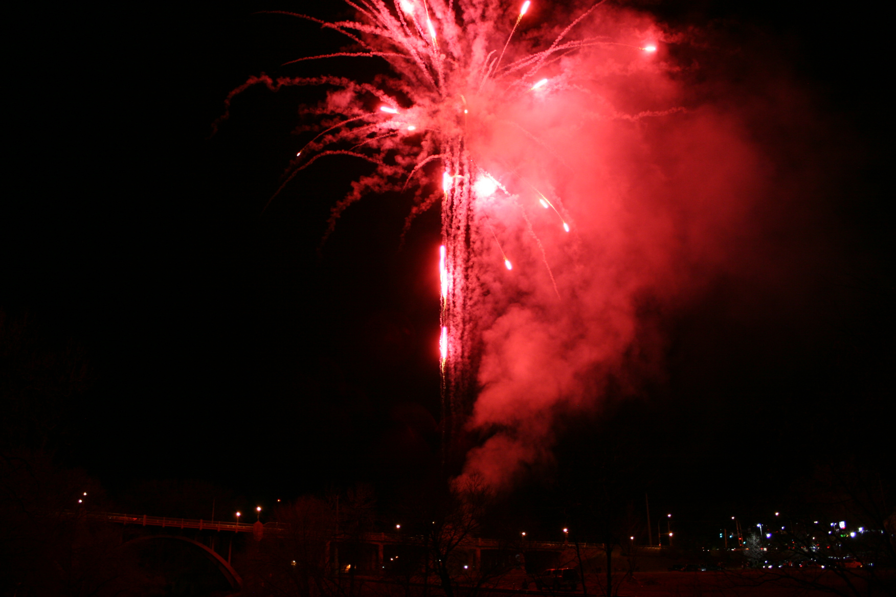 I stood near Randy on the footbridge, aiming my camera lens skyward, toward the celebratory display launched from a nearby grassy space by the Straight River. Near the viaduct which carries foot and vehicle traffic from east to west and west to east.