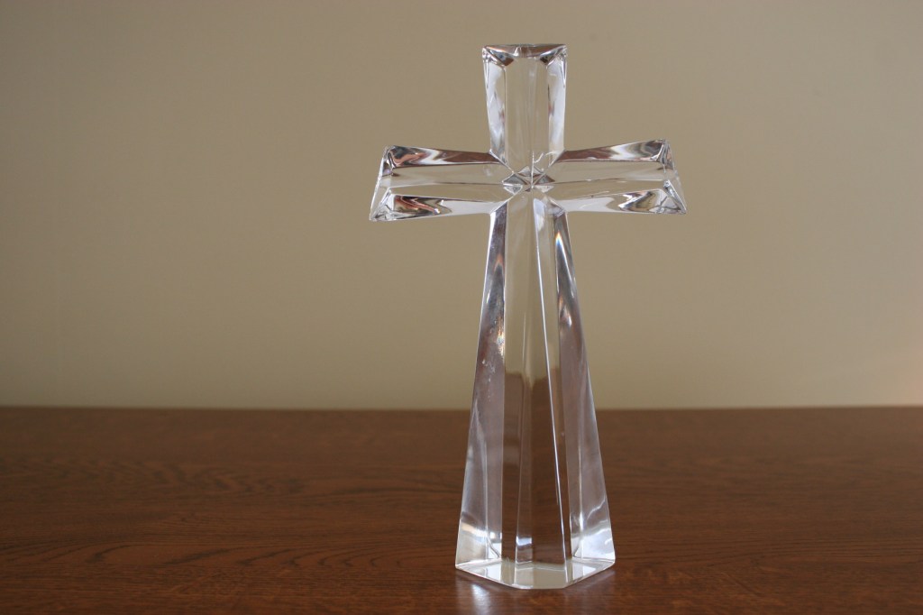 The beautiful lead crystal cross included in a lovely floral arrangement from my son-in-law Marc’s parents, Eric and Lynn. (Minnesota Prairie Roots copyrighted photo January 2022)