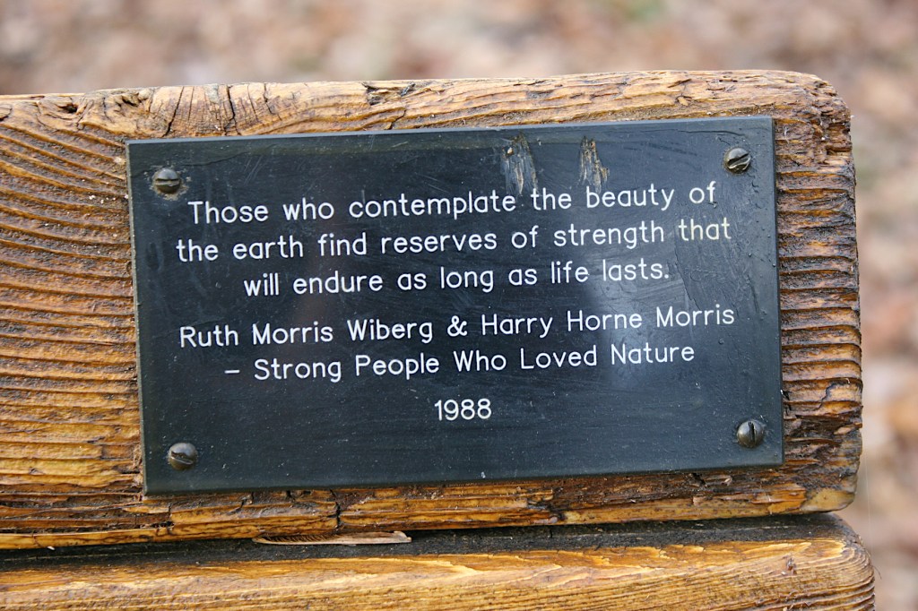 A memorial plaque on a bench at River Bend Nature Center. (Minnesota Prairie Roots copyrighted photo November 2021)