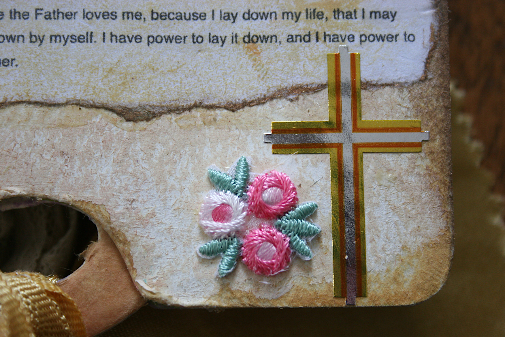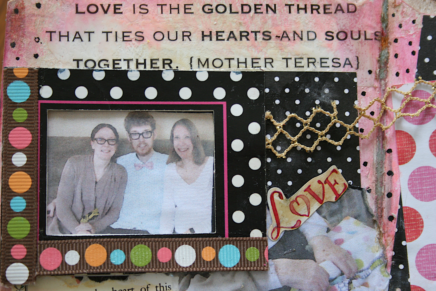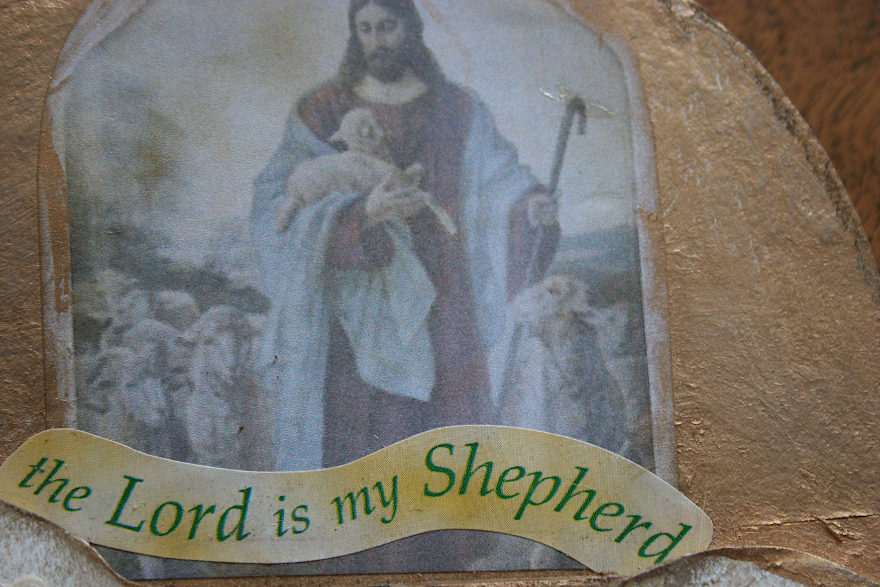 No detail went unnoticed by my friend in creating this work of art. In a mini-bottle attached to the book, “Amazing Grace” labels a music scroll. That was among three hymns sung at Mom’s funeral. Polka dotted ribbon and paper frame two family photos, matching the polka dotted blanket covering my Mom’s lap and the polka dots decorating her great grandson’s birthday cake in two images. A swatch of gold lace mimics the frame of my mom’s “The Good Shepherd” print which now hangs on my dining room wall. Kathleen incorporated selected “good shepherd” verses from John 10 (read at the funeral) into the book along with a photo of that cherished print.