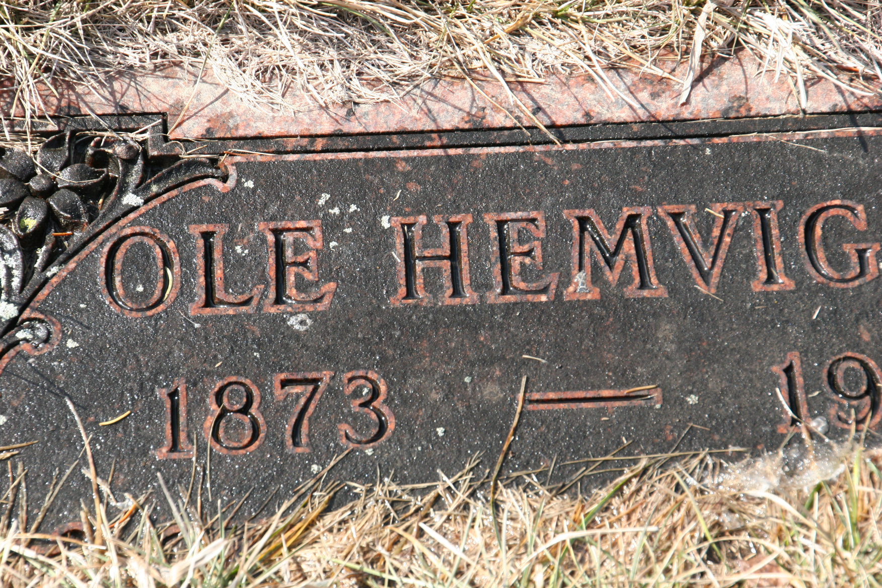 The in-ground marker of Ole Hemvig. (Minnesota Prairie Roots copyrighted photo March 2022)