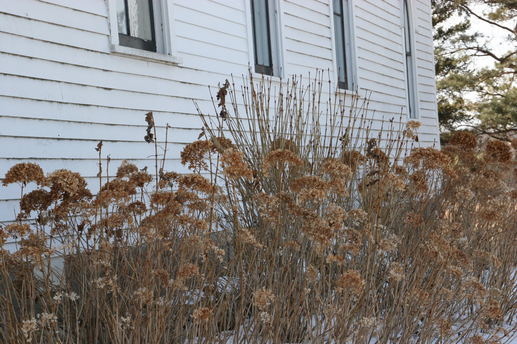 Dried hydrangea alongside the wooden church. (Minnesota Prairie Roots copyrighted photo March 2022)