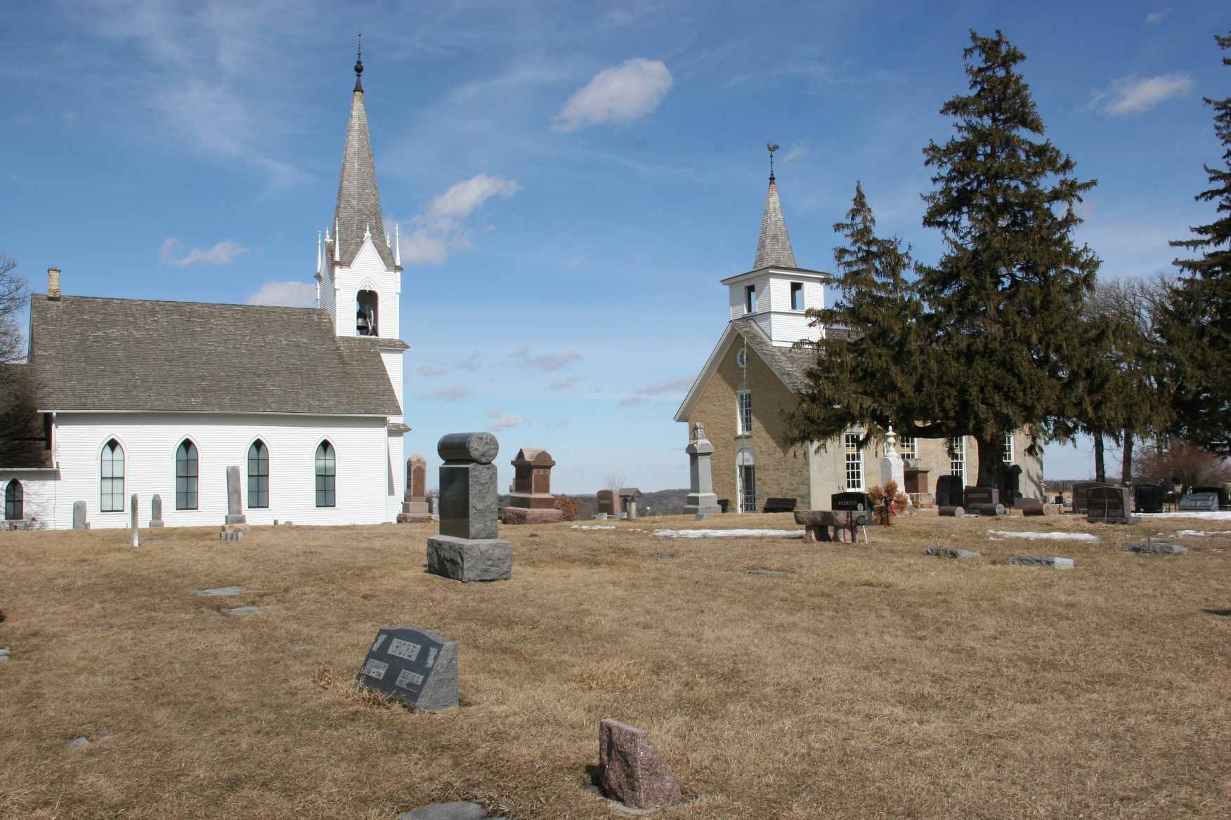 This is Valley Grove, overlooking the countryside, the place where Norwegian immigrants came. Here they crafted their first church from stone in 1862, then built a second, of wood, in 1894. Both still stand.