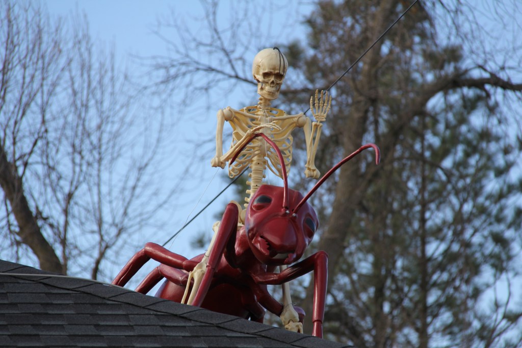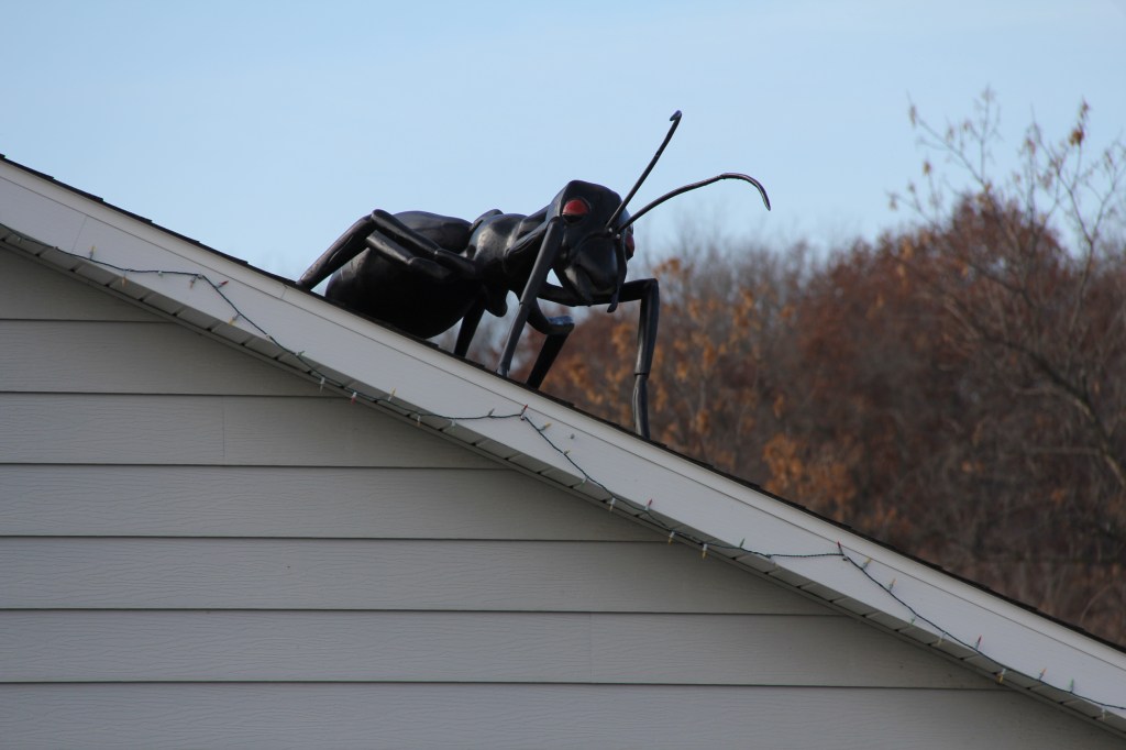 Drive by the business and you’ll spot four over-sized red ants crawling on the roof and a fifth climbing a ladder, right behind a skeleton. Skeletons ride all the rooftop ants.