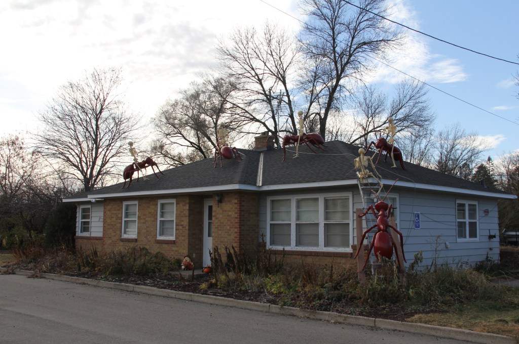 FYI: To see the rooftop ants and skeletons, take Exit 59 off Interstate 35 onto Minnesota State Highway 21/Lyndale Avenue into Faribault. Drive about a mile and Francis Pest & Animal Control will be on the right side of the highway. You can get a close view from the service road or the recreational trail which runs right past the business. The pest control company is right next to White Sands Dog Park.