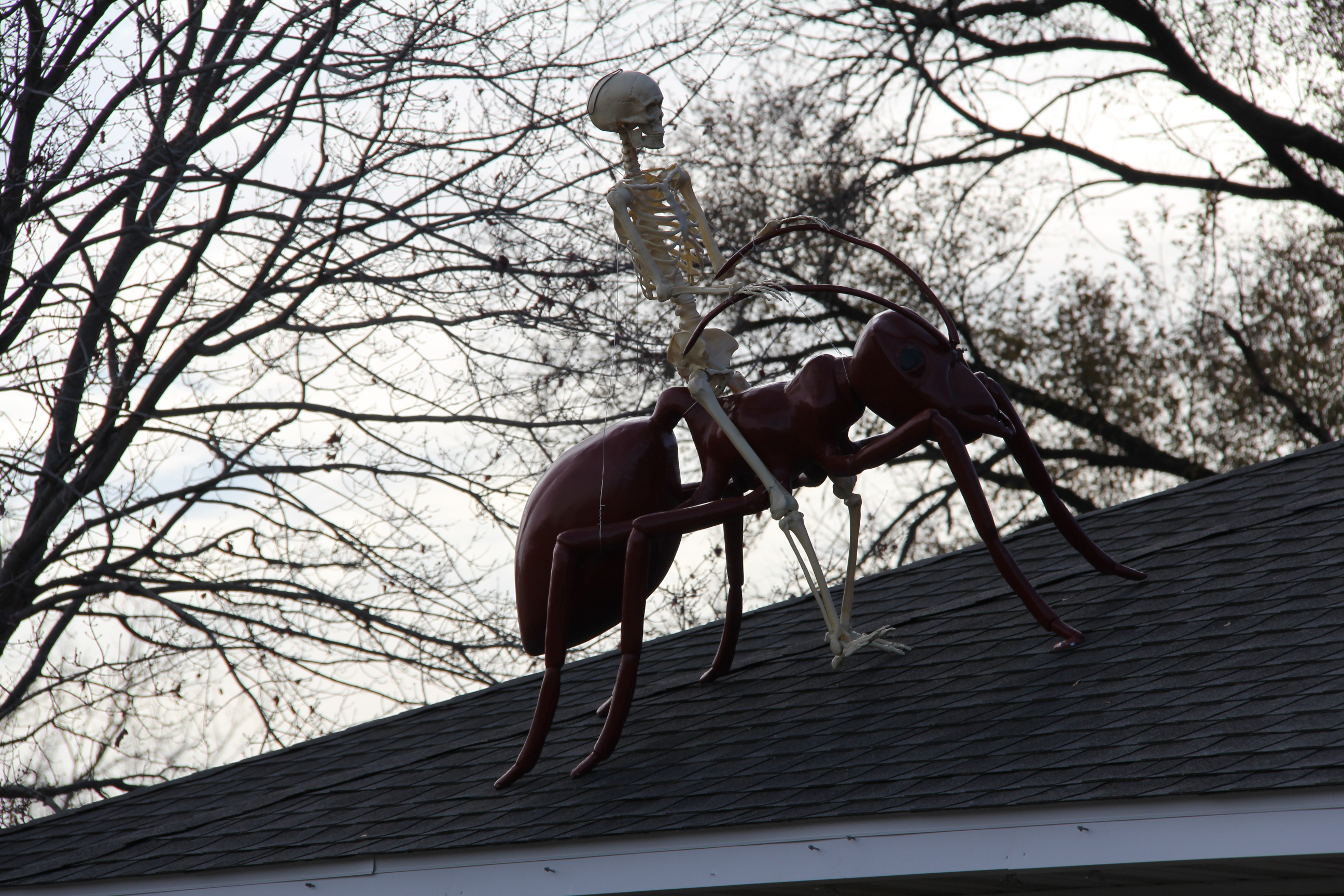 The ants have been in place for awhile. The skeletons are seasonally-new, ideal to celebrate Halloween.