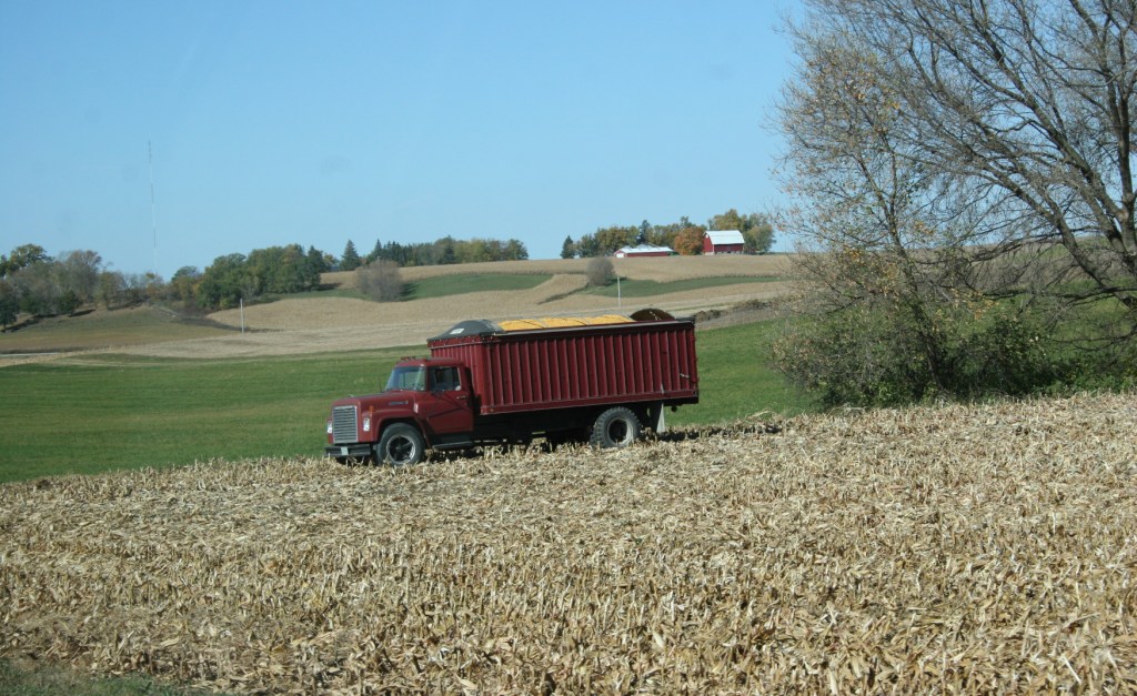 A grain truck holds the corn harvest. (Minnesota Prairie Roots copyrighted photo October 2022)