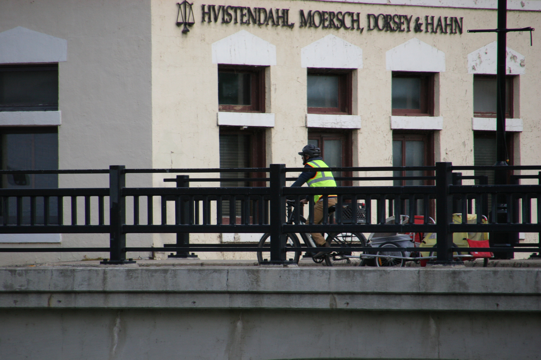 People were out and about. Dipping into Just Food Co-op. Shopping at the thrift store. Sitting on a park bench waiting to share a faith message. Walking a dog. Biking across a bridge spanning the river.