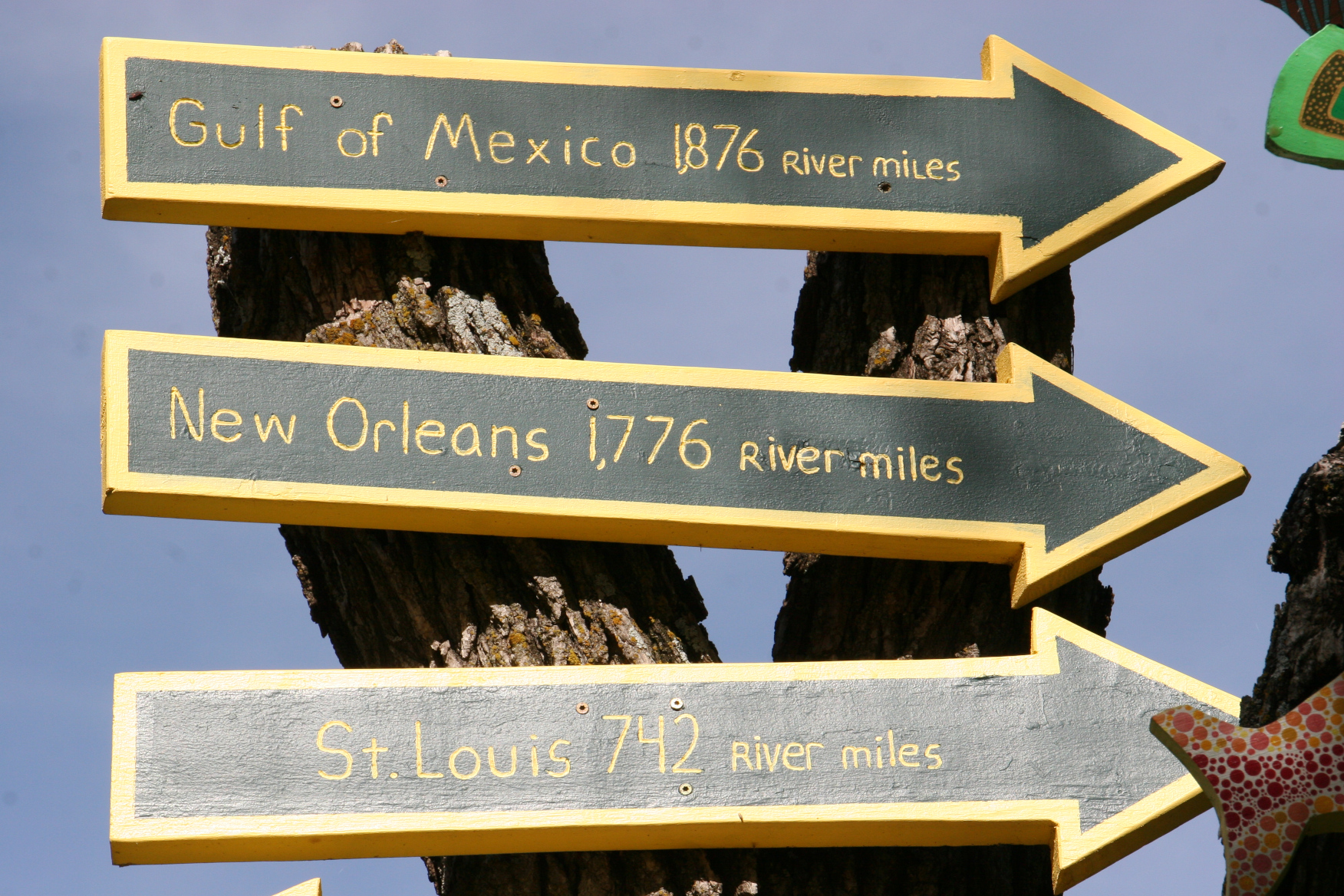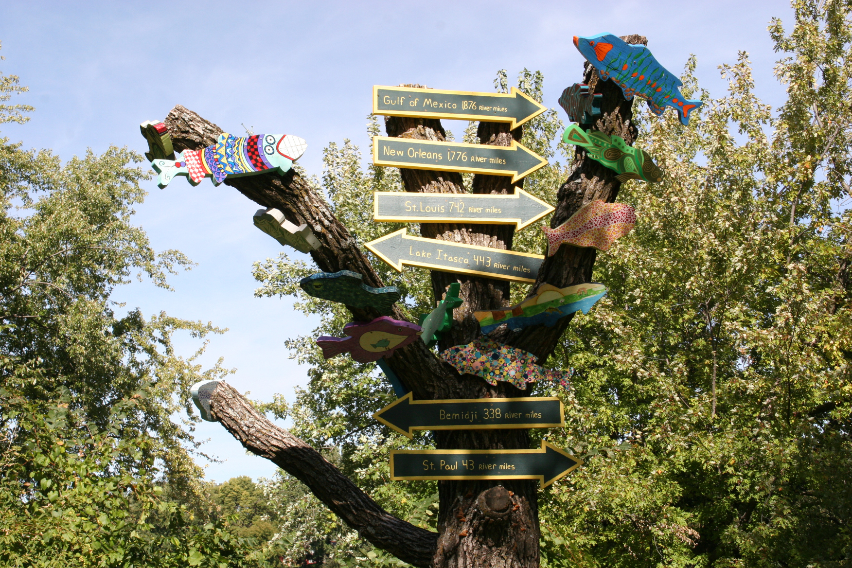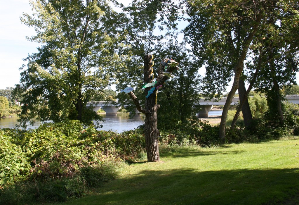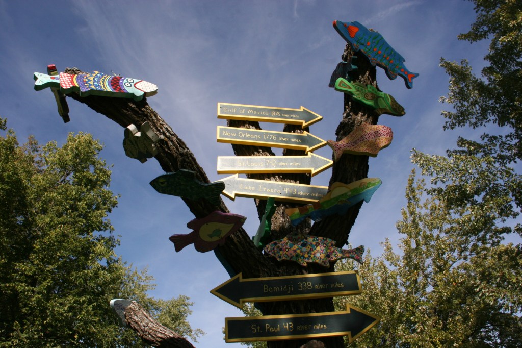 Yet, even if not peaceful, the park is worth visiting. I discovered here a MontiArts Community Project, “The Funky Fish Sign.” Wooden fish cut-outs painted by community members are attached to the trunk of a dead oak as are wooden arrows crafted from old park benches. Those arrows list destinations and river miles from Monticello. To Lake Itasca, 443 river miles. To St. Paul, 43 river miles. To New Orleans, 1,776 river miles.