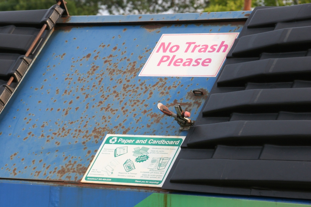 Rules on a recycling container in Northfield. (Minnesota Prairie Roots copyrighted photo August 2022)