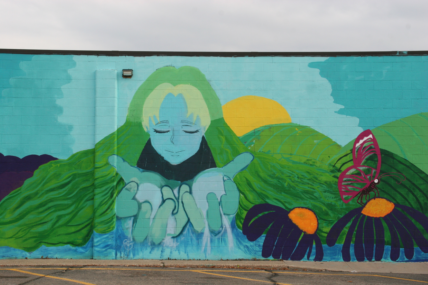 Youth and adults painted a mural on Just Food Co-op, Northfield. Among the themes, Mother Earth. Rice County Neighbors United led the grant-funded project. (Minnesota Prairie Roots copyrighted photo October 2021)