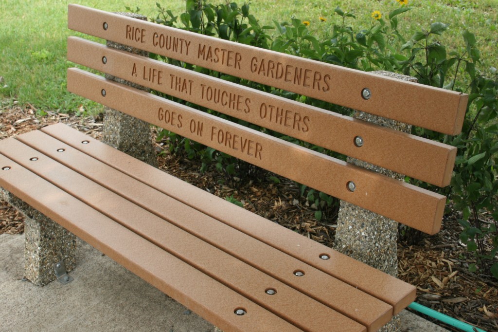 Inspirational messages on benches in public spaces always draw my attention and my camera lens. Whether at a nature center, city park, garden or elsewhere, I will pause and read such uplifting quotes. I loved this message on a bench at the Rice County Master Gardeners Teaching Gardens in Faribault. Touching the lives of others in a compassionate and meaningful way is among the greatest legacies one can leave.