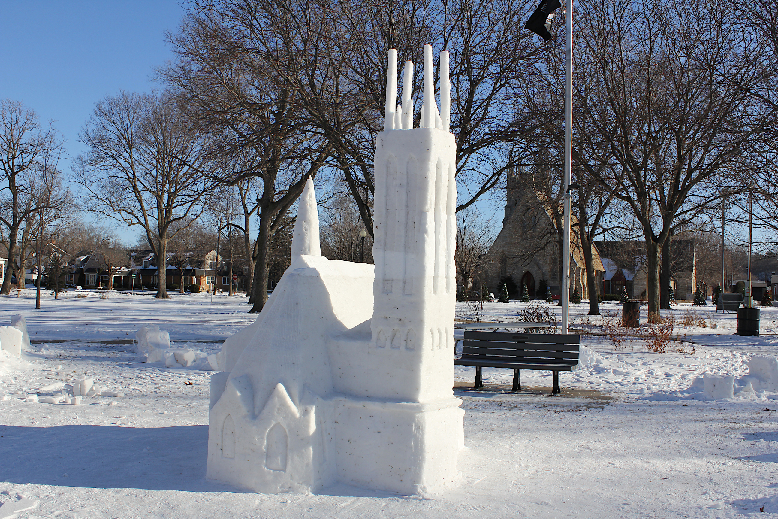 Across the Straight River in Faribault’s Central Park, a team of Shattuck students and staff recently shared their artistic skills with the community by creating a snow sculpture of the historic Cathedral of Our Merciful Savior. The massive cathedral sits within view of the sculpture along Second Avenue.
