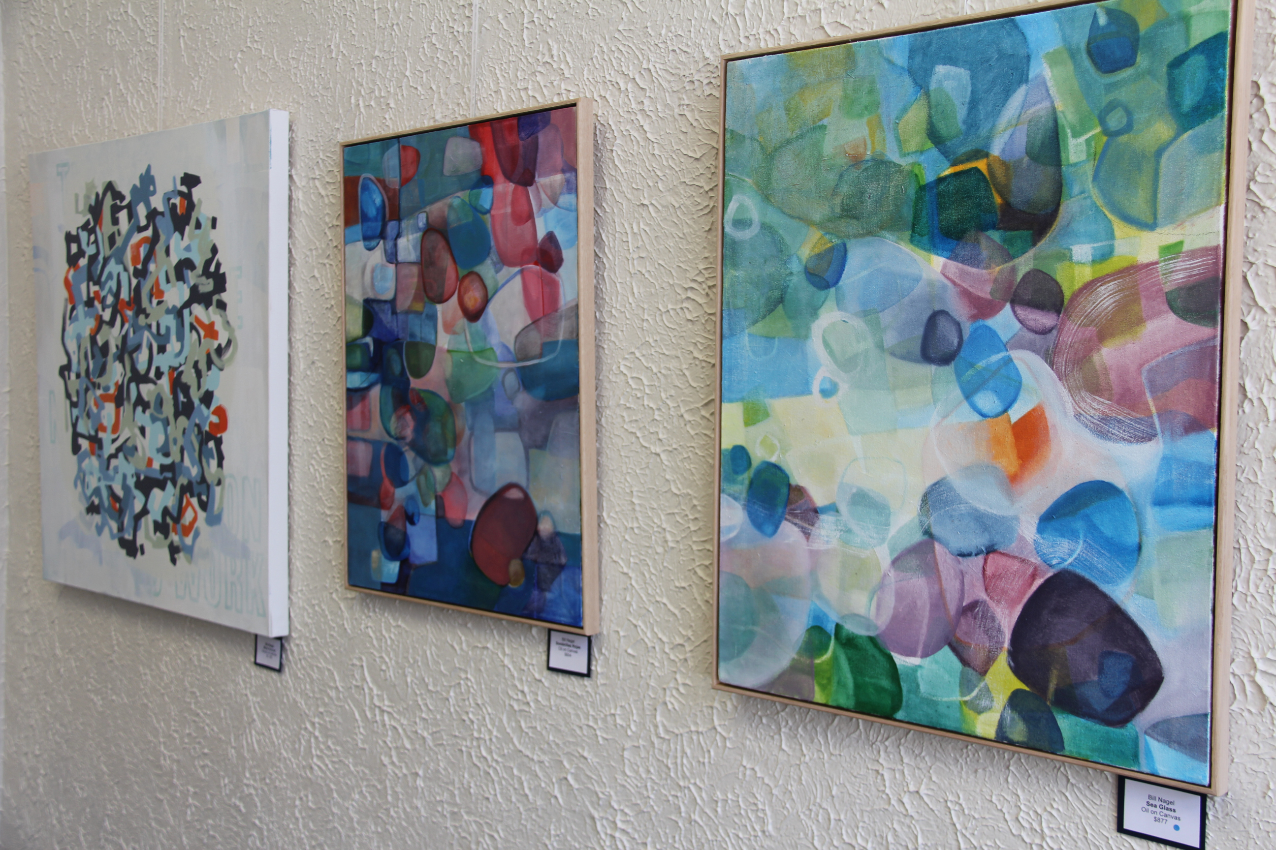 “Keep Going Forward,” Amanda Webster’s acrylic, right, leads to more of her abstract paintings. (Minnesota Prairie Roots copyrighted photo March 2023)