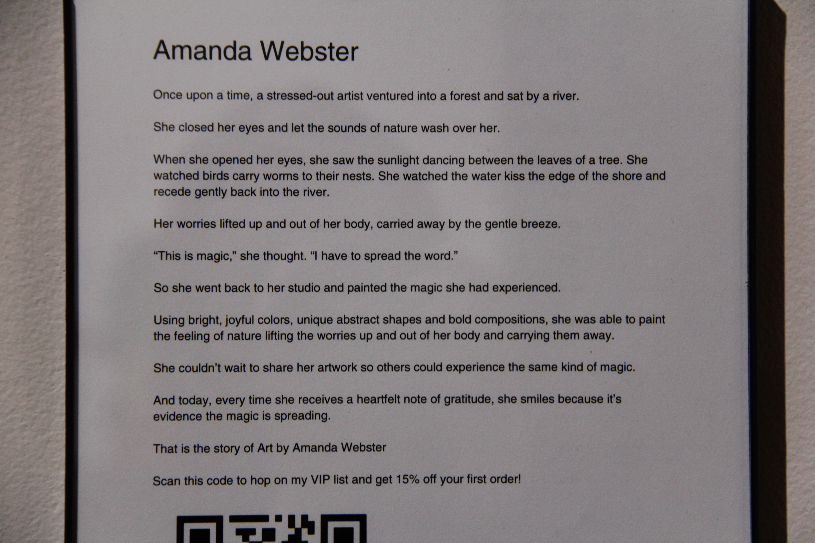 Amanda Webster’s artist statement reveals the story behind her abstract art. (Minnesota Prairie Roots copyrighted photo March 2023)