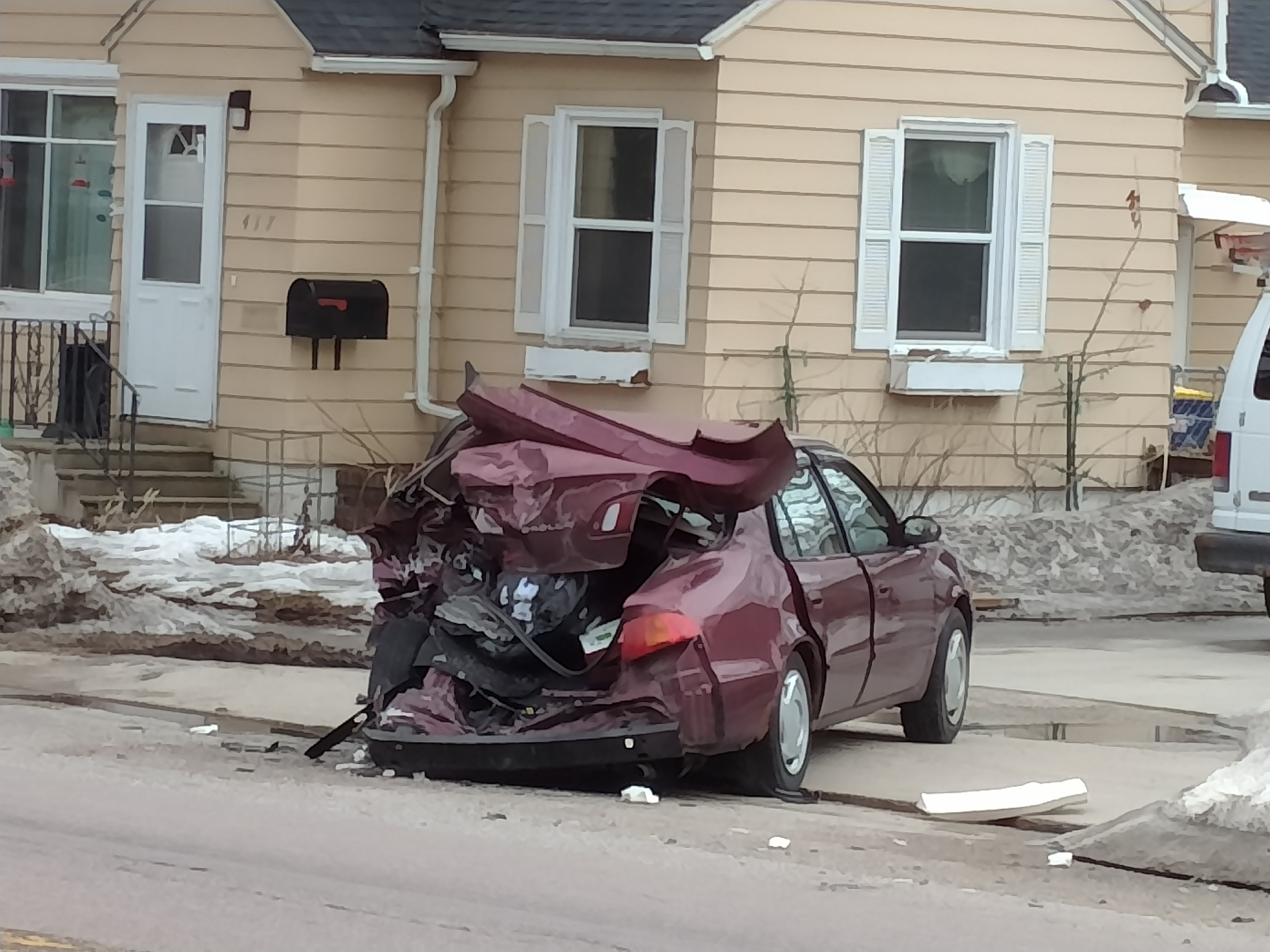 My neighbor’s totaled car, photographed Wednesday morning. That’s another neighbor’s house in the image.The car is exactly where it landed after being slammed into by a hit-and-run vehicle Tuesday evening. (Minnesota Prairie Rights copyrighted photo March 2023)
