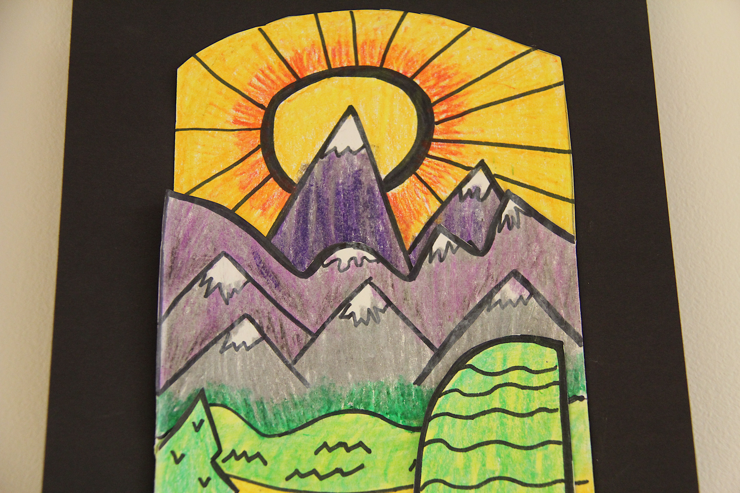 “Tri-Fold Cut Landscape in Crayon” by Addyson, Lincoln Elementary School 5th grader. (Minnesota Prairie Roots copyrighted photo March 2023)