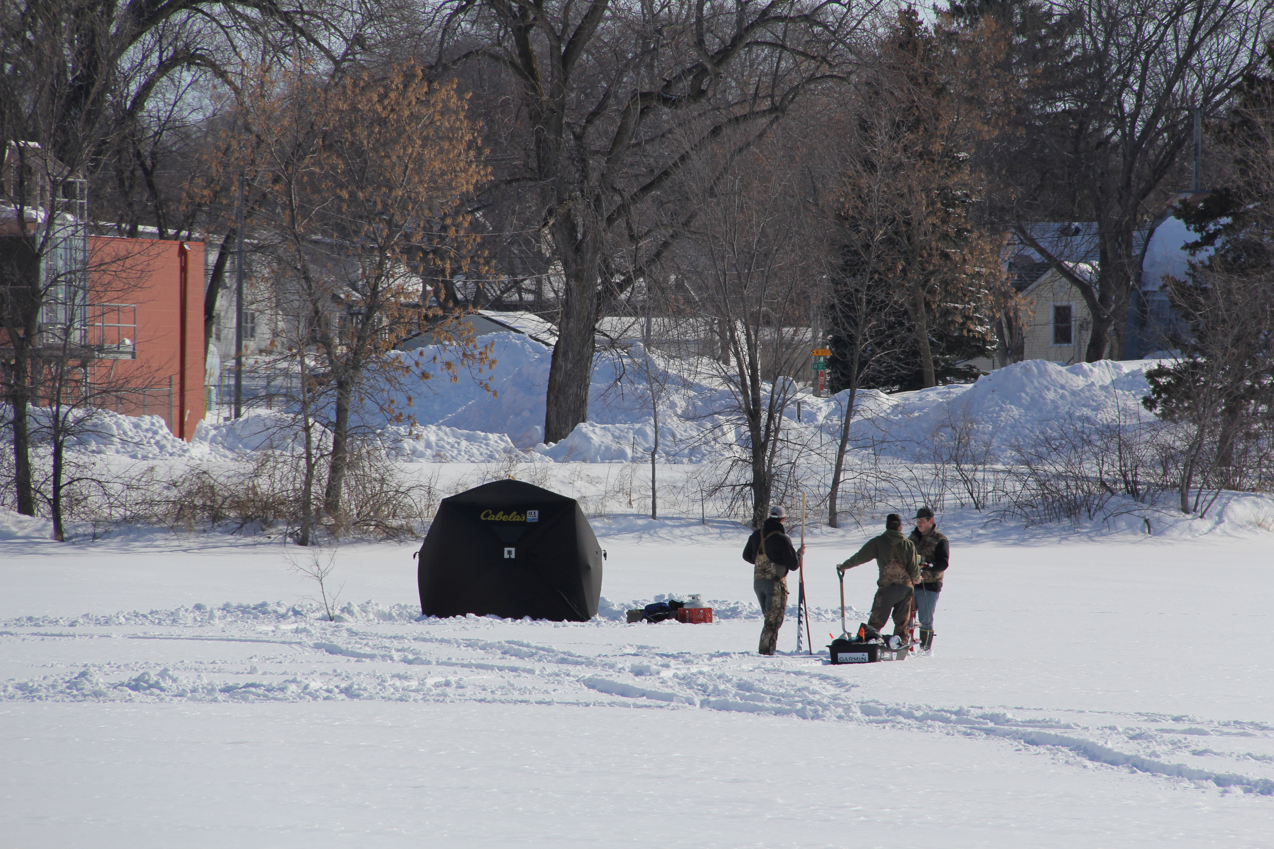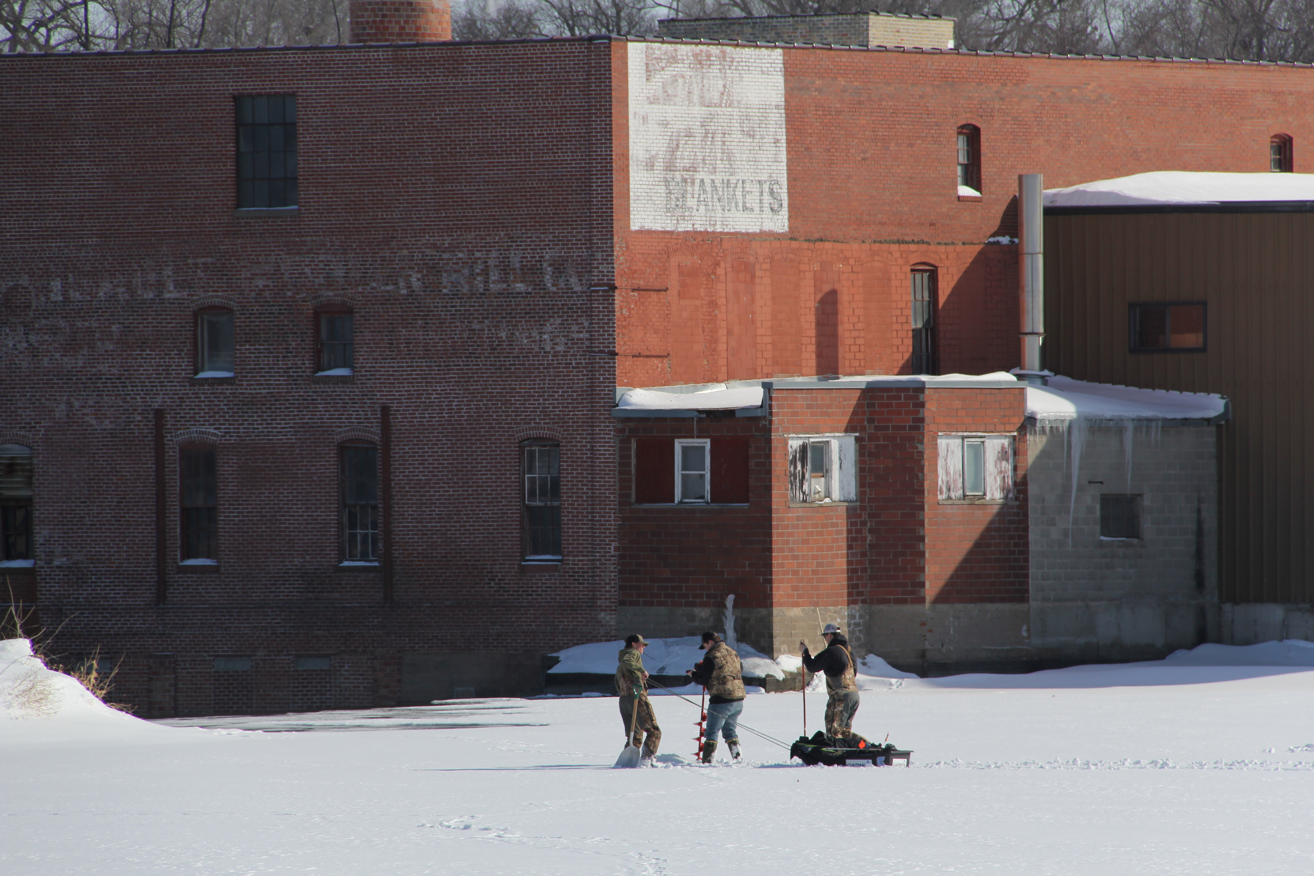 But I appreciated that they were out enjoying the 30-degree sunny afternoon, warm enough even to shed their gloves and heavy coats. They’d already set up two portable fish houses by the time I arrived at North Alexander Park. I stood there and observed as the trio carried ice auger, ice saw, and scoop shovel and towed a sled with fishing gear across the snow-covered river. I was uncertain whether they were spearing for or simply angling for fish. Turns out neither.