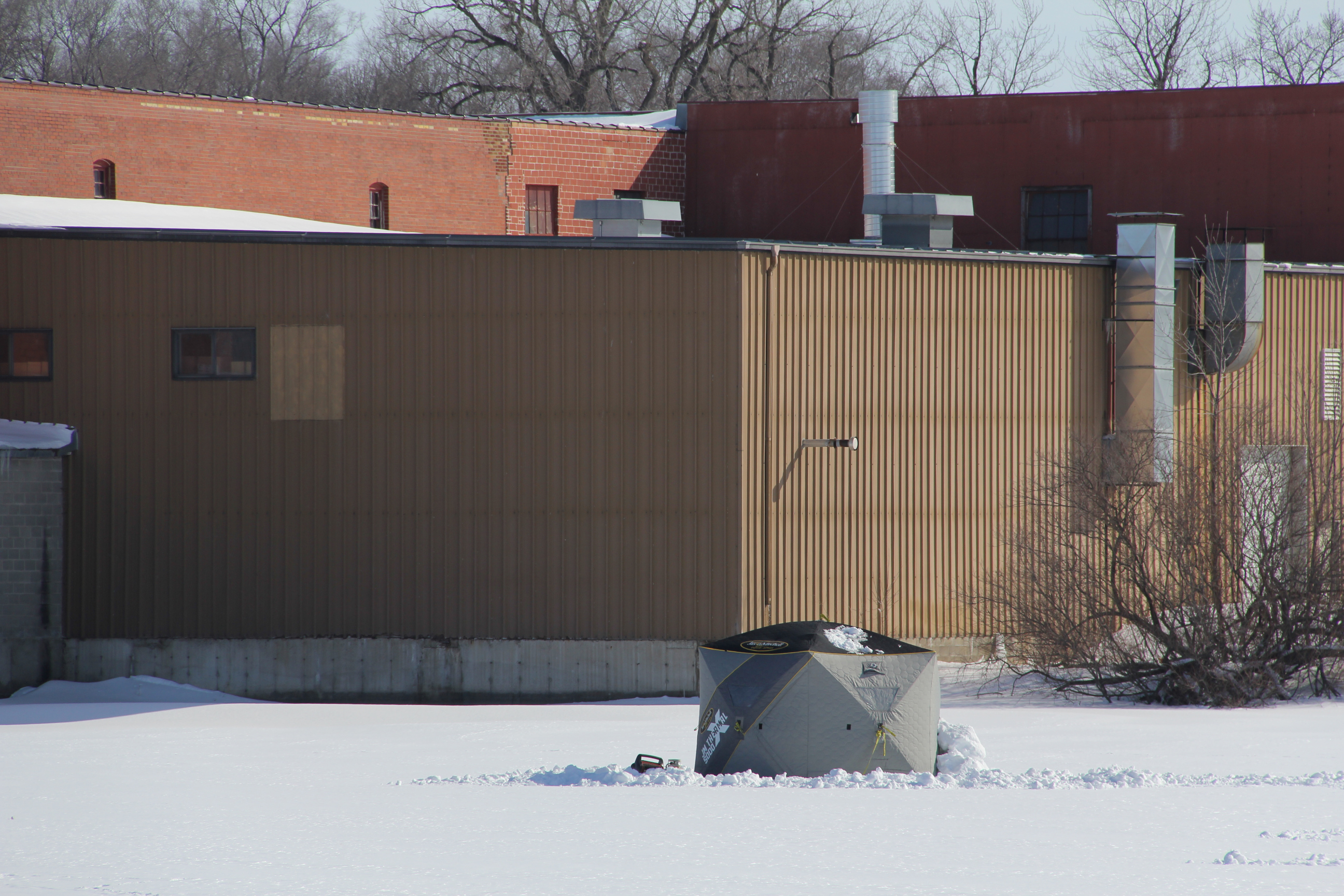 Sunday afternoon while out and about in Faribault, I came upon three guys with ice fishing equipment on the frozen Cannon River Reservoir by the Woolen Mill Dam. As I watched, I hoped they knew what they were doing because I didn’t feel all that confident in the strength of the river ice with water flowing below.