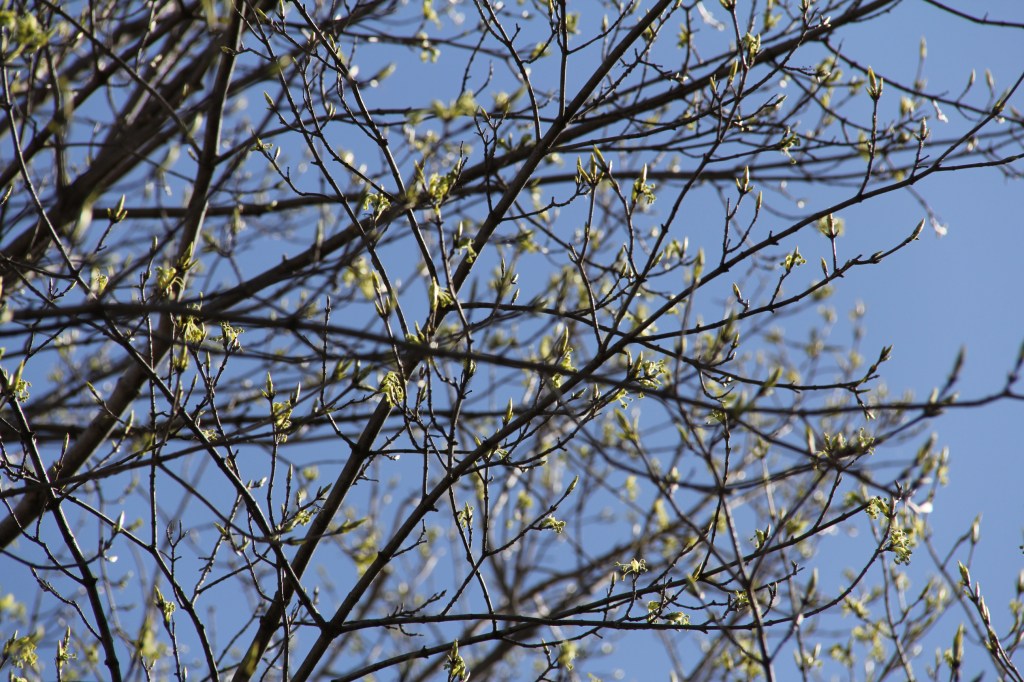 I need only step into my yard to take in the greening of spring. Buds forming and then unfurling on the maple.