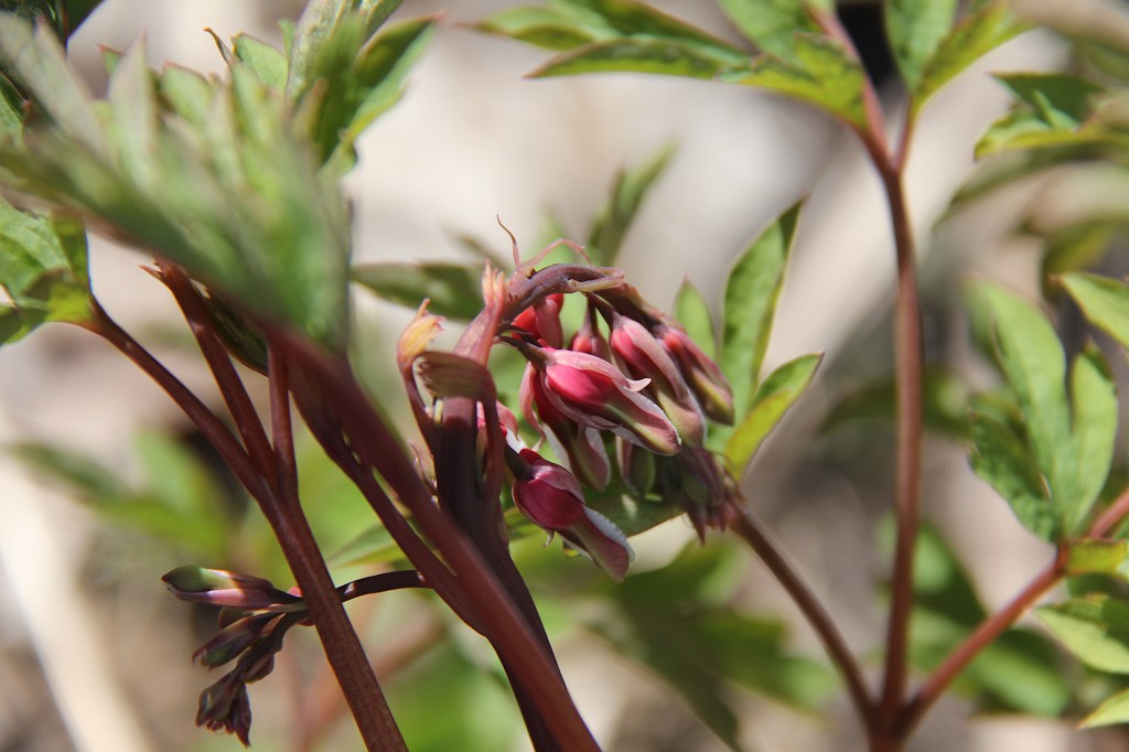Clumped, clamped buds about to open into fuchsia bleeding hearts.