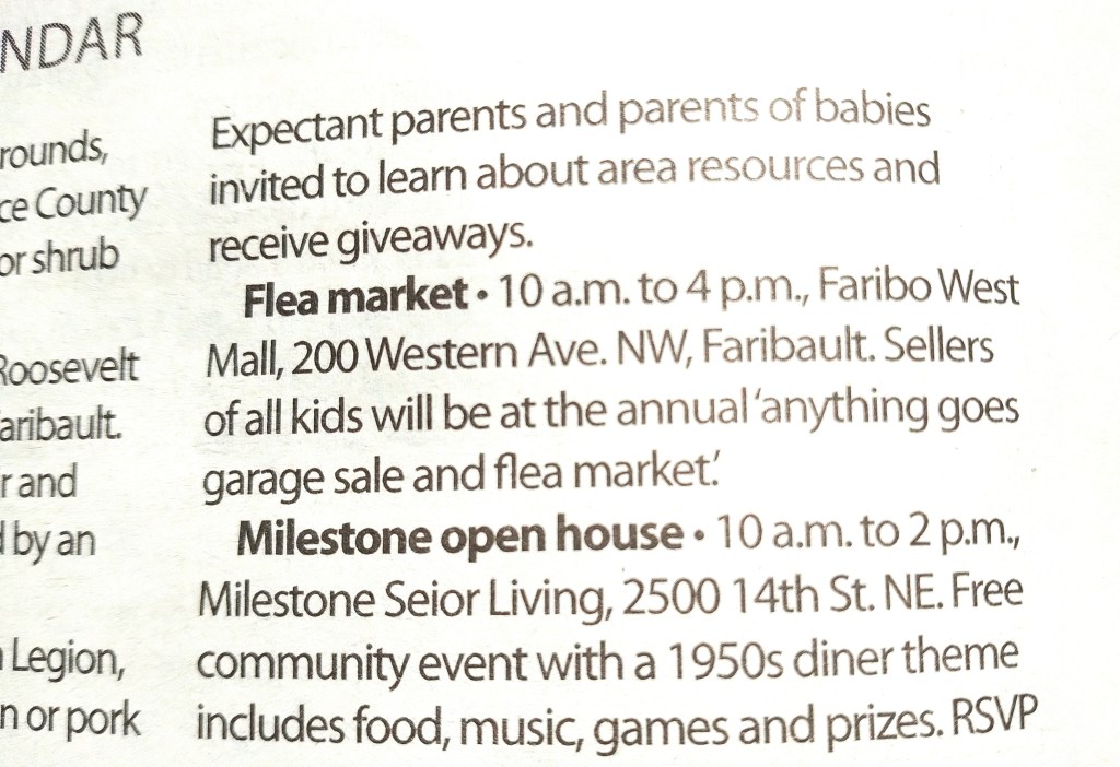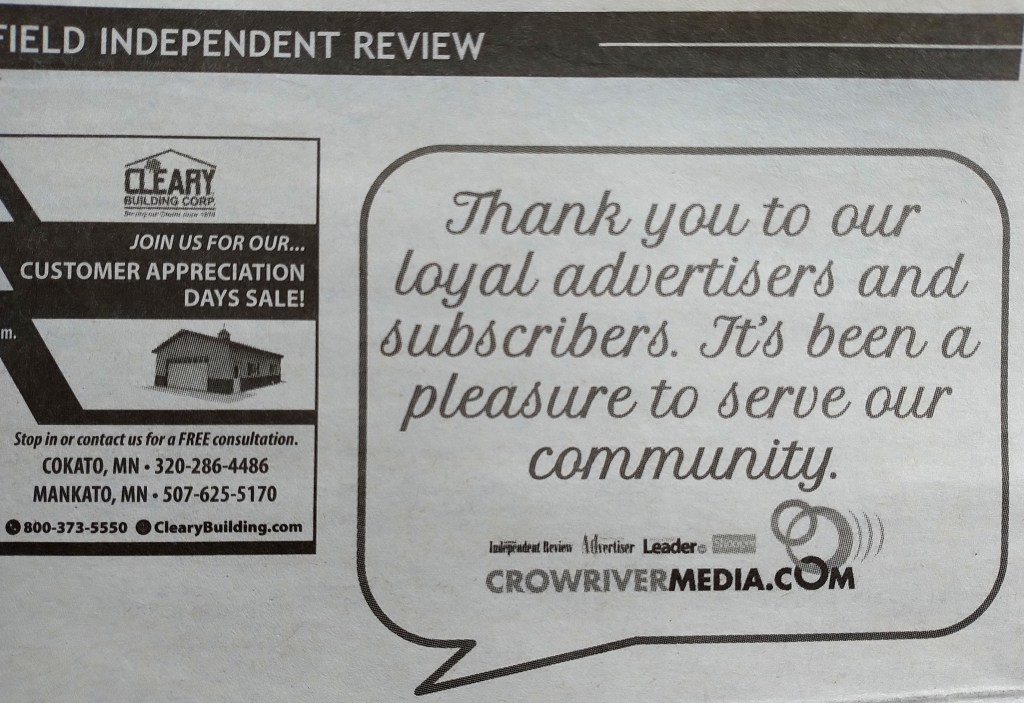 And now that print coverage is lost in all these southern Minnesota towns, cities and rural areas: The watchdog coverage of school board, city council, county board, planning and zoning, and other government bodies. The stories about crime and tragedies. The stories about community events and celebrations. The interesting features that focus on people. Local sports and arts and entertainment stories. Community calendars, school honor rolls and lunch menus. Graduation. Obituaries and much more.