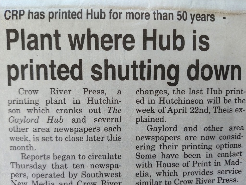 Yes, I’m feeling a tad nostalgic and sad thinking of the closure of Crow River Press. The recent shut-down left the publisher of The Gaylord Hub, and other small town newspaper owners, scrambling for a place to print their papers. Many printing plants, like community papers, have met their demise in Minnesota as large media groups acquired papers and plants.