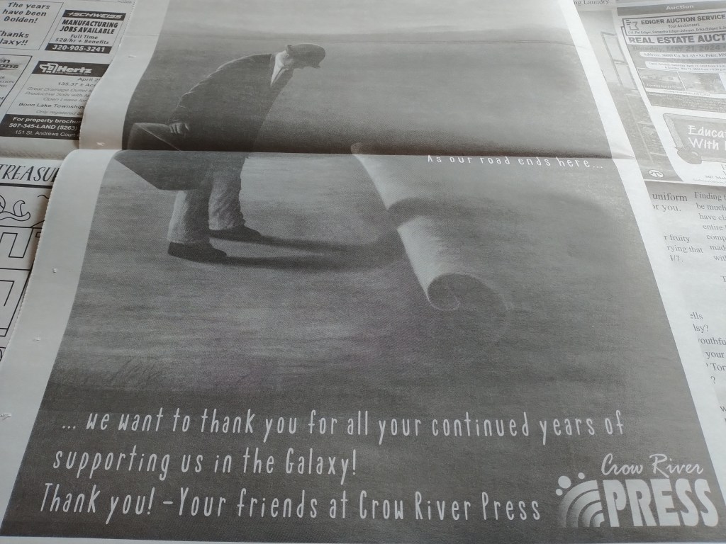 If you have ever read a community newspaper, then you knew the deceased. For it is eight Minnesota newspapers, not individuals, that died. Ceased publication, only weeks after an announcement of their forthcoming funerals.