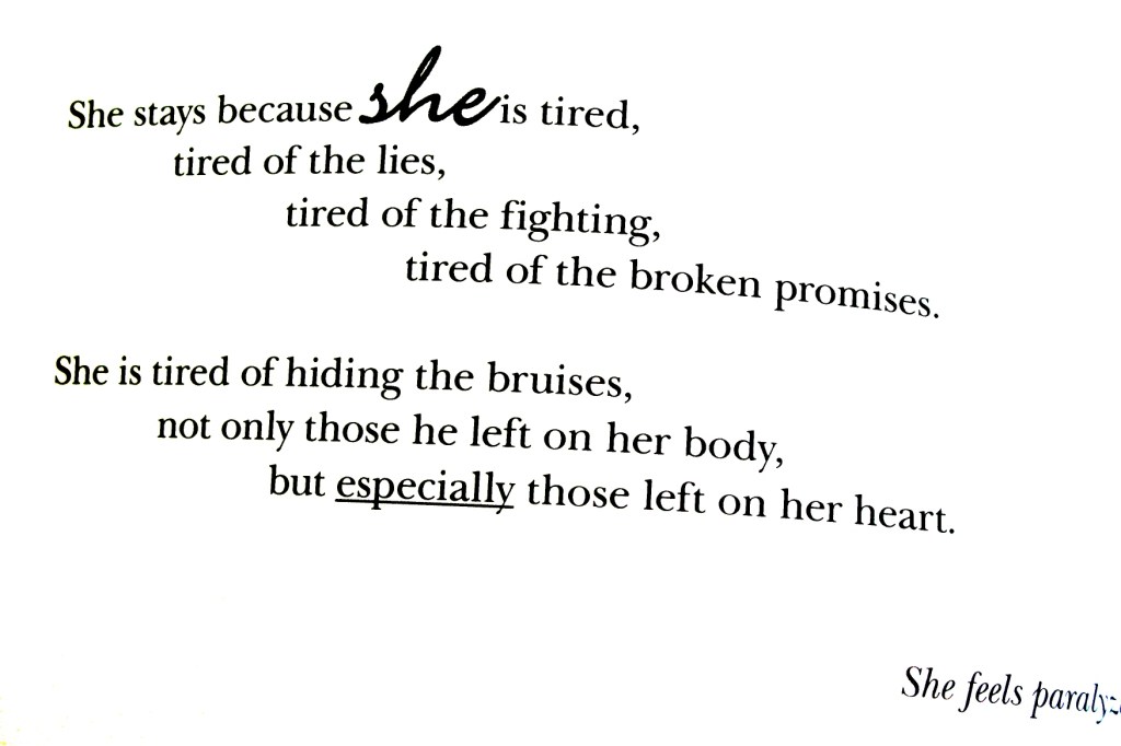 COMMENTS: If you recognize yourself or someone you love in my fictional story, first know that you are not alone. Help is available through organizations that will support you and/or your family. That may be a shelter or an advocacy/outreach organization focused on preventing domestic violence, providing education and resources, and simply being there for you. If you’re not ready for that step, talk to a trusted friend or family member. Seek help.