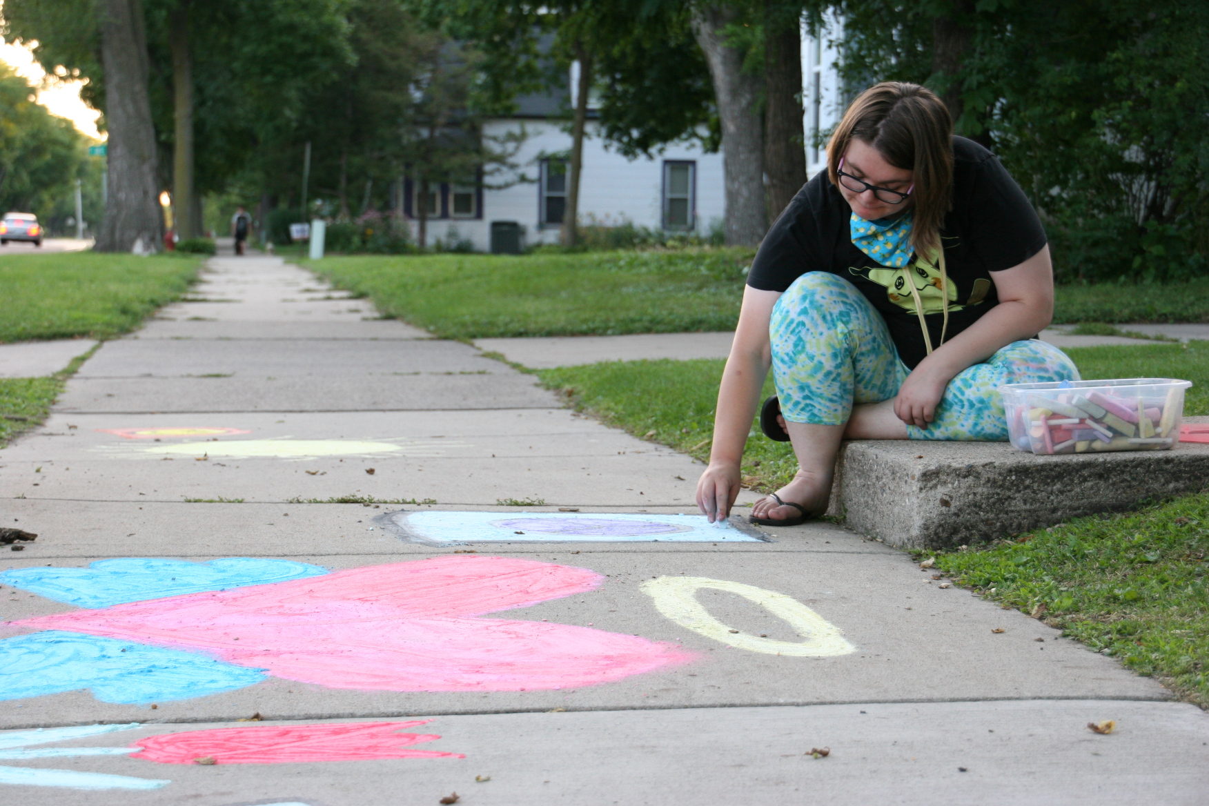 My photo of Jane chalking art on a Faribault sidewalk. (Minnesota Prairie Roots copyrighted file photo August 2020)