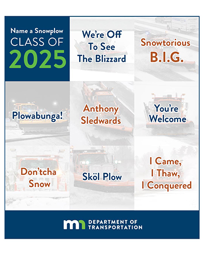 A snowplow in my native southwestern Minnesota will now bear the name spun off from a line in “The Wizard of Oz” starring native Minnesotan Frances Gumm, aka Judy Garland. Her hometown of Grand Rapids (Minnesota, not Michigan) is located in MnDOT’s District 1 on the northeastern side of our state. A plow in that region will be tagged SKOL Plow, a tribute to the Scandinavian cheer chant for the Minnesota Vikings. That name came in at number seven in the polls.