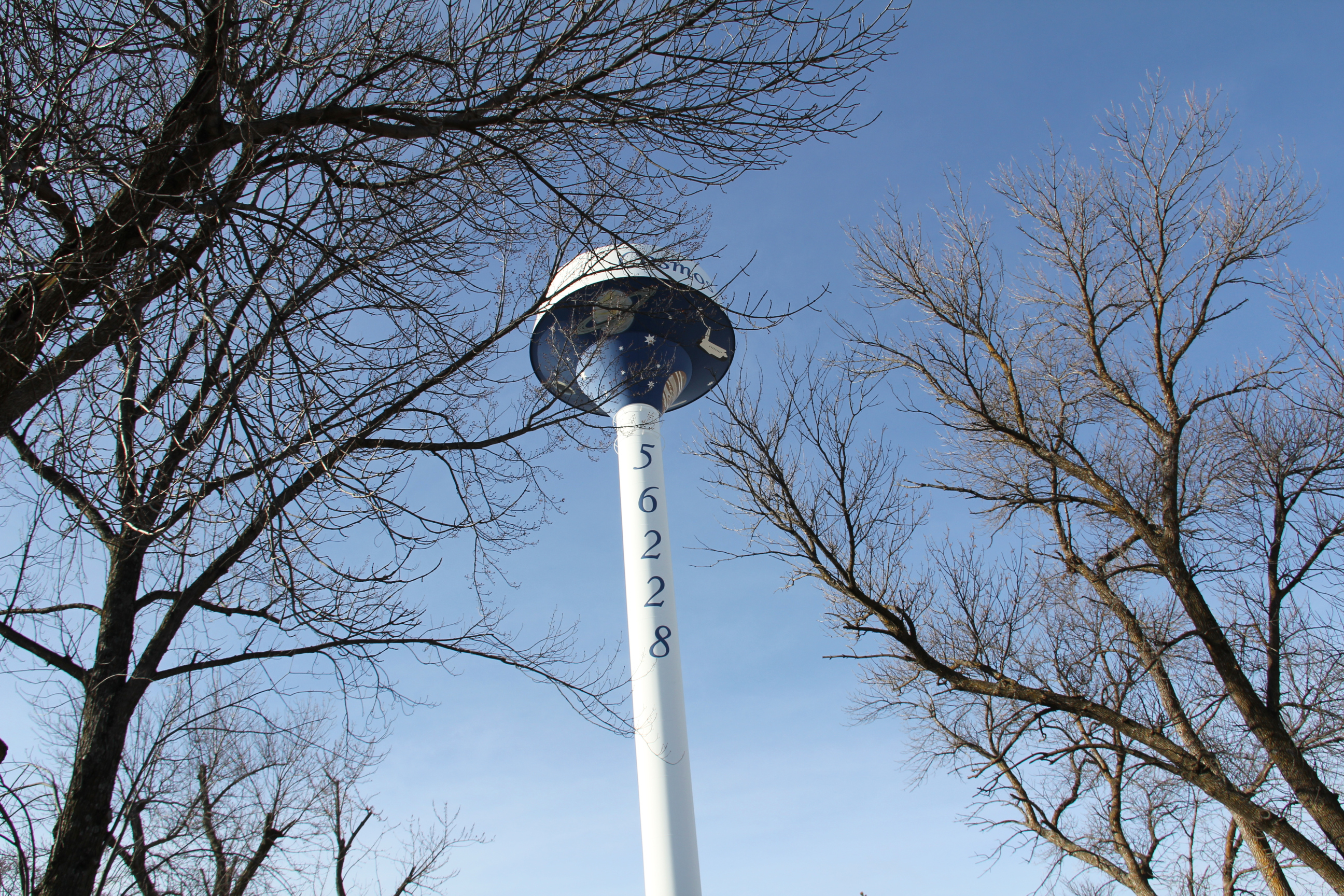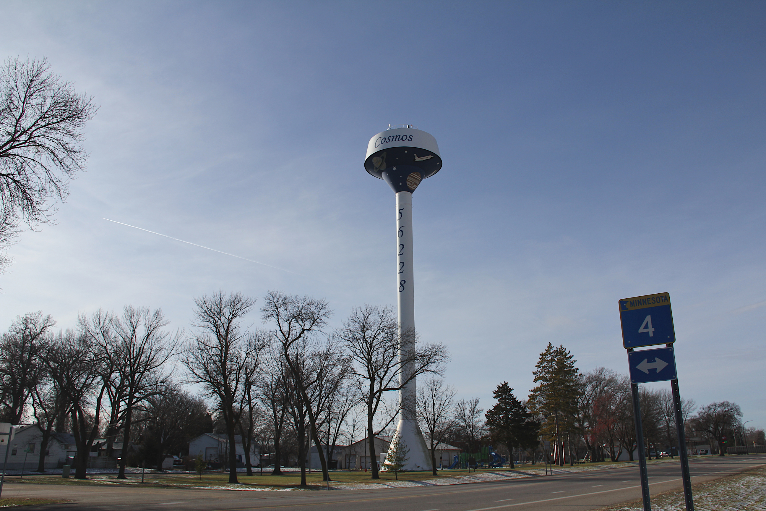 With a town name like Cosmos (originally called Nelson), it should come as no surprise that the community would build on the Greek word meaning “order and harmony.” The cosmic focus makes this place along Minnesota State Highways 7 and 4 stand out among all the other little towns in this part of the state. When I spotted the water tower with a space shuttle, planets, stars and more painted on its underbelly, I immediately wanted to stop and photograph this work of art, this town identifier.