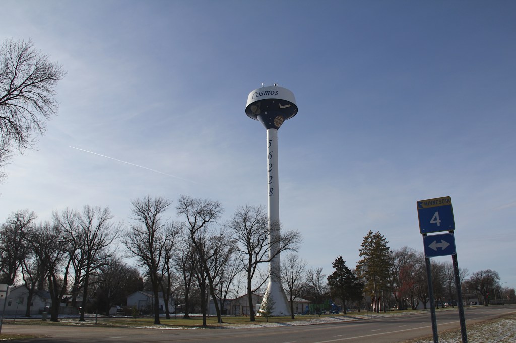 My first view of the space-themed water tower in Cosmos. The town is located at the intersections of Minnesota State Highways 4 and 7. (Minnesota Prairie Roots copyrighted photo November 2024)