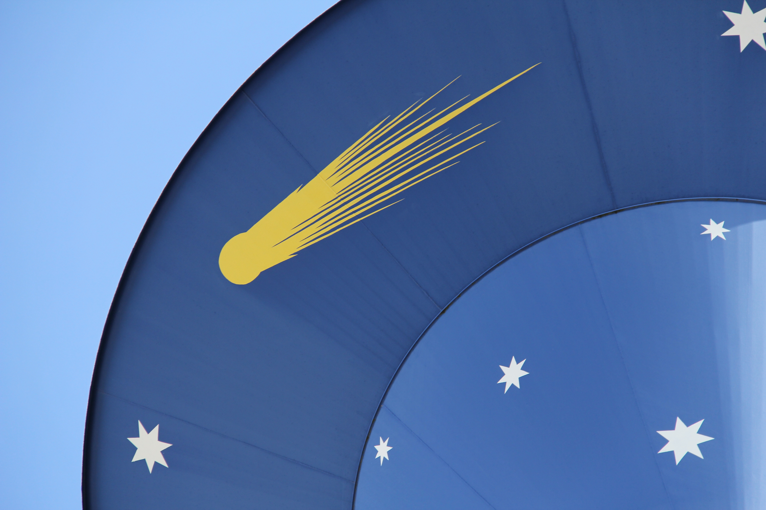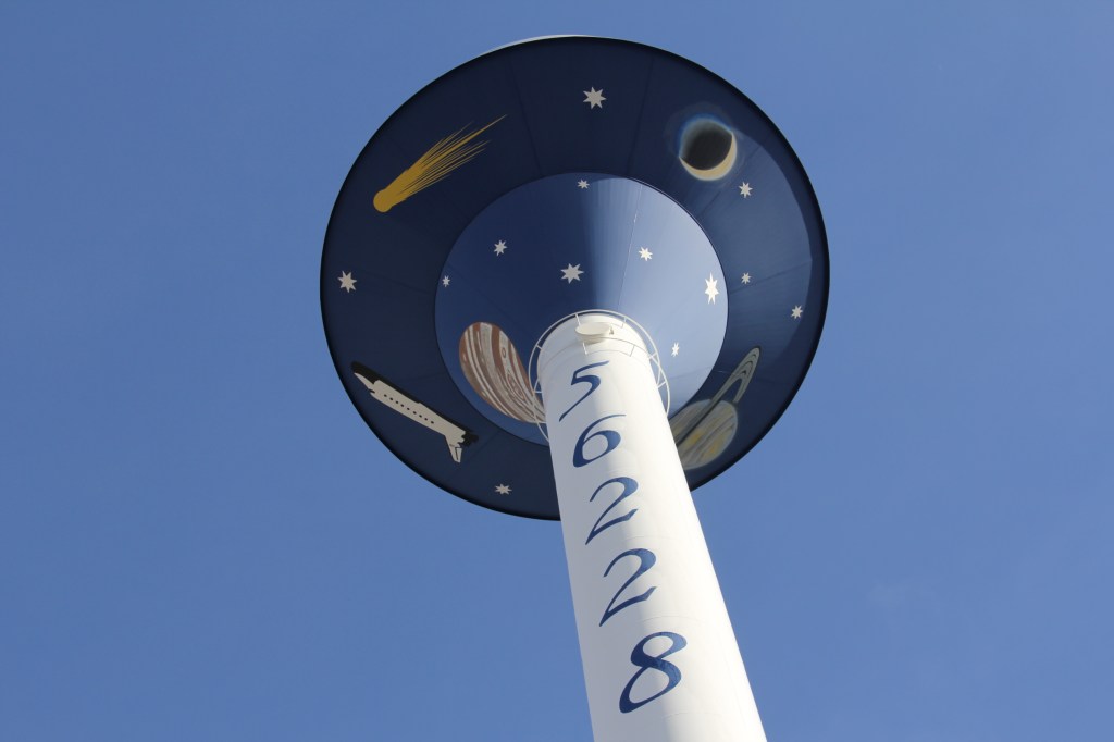 The underbelly of the Cosmos water tower is themed to space. (Minnesota Prairie Roots copyrighted photo November 2024)