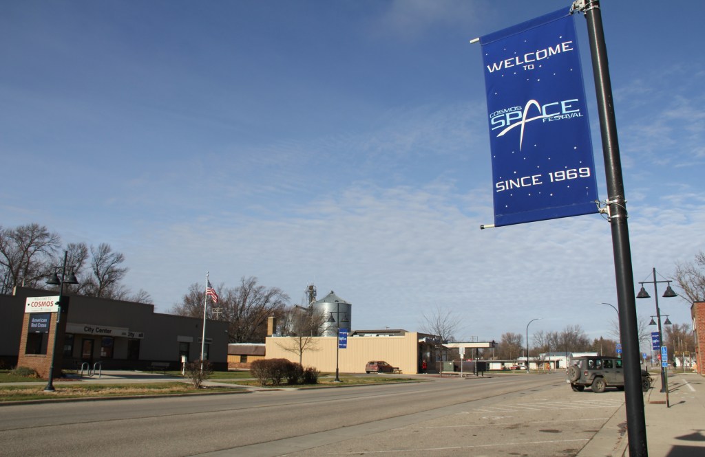Cosmos Space Festival banners hang throughout the downtown, shown here. (Minnesota Prairie Roots copyrighted photo November 2024)