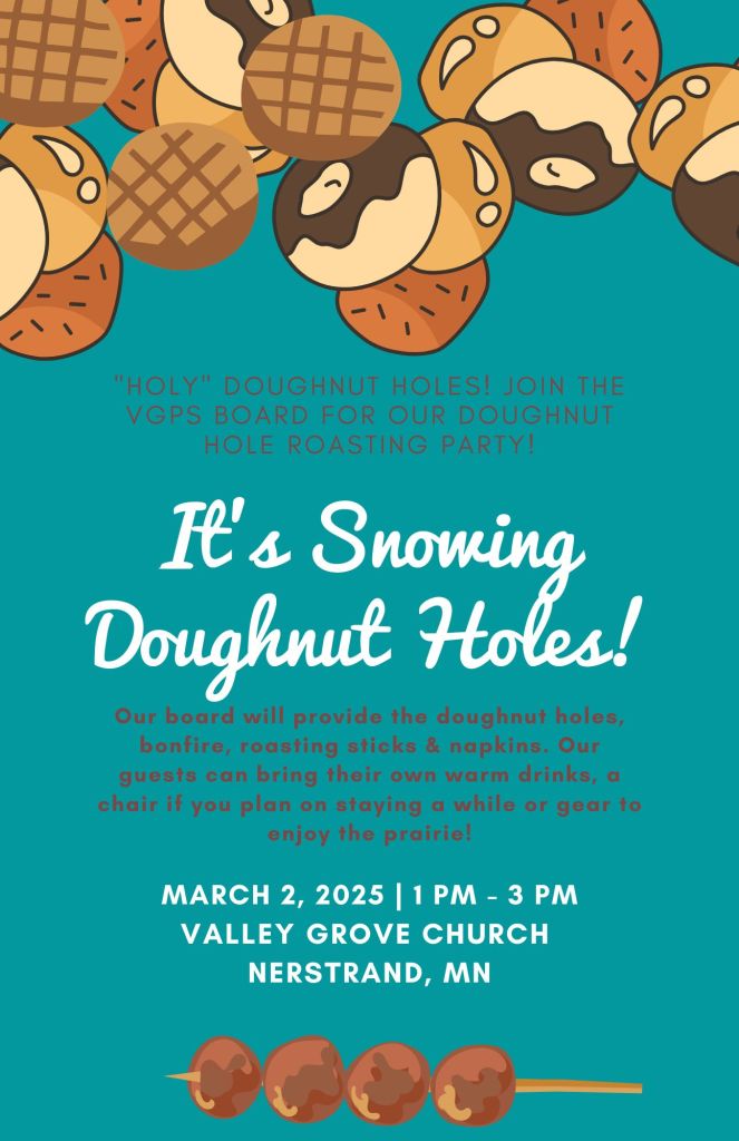 On Sunday, March 2, head over to the Nerstrand area for a 1-3 p.m. free Doughnut Hole Roasting Party at the historic Valley Grove Churches. This hilltop setting, 9999 155th St. East, is perhaps my favorite rural location in Rice County because of its beautiful natural setting and peacefulness. Plus, I love the two historic churches there.