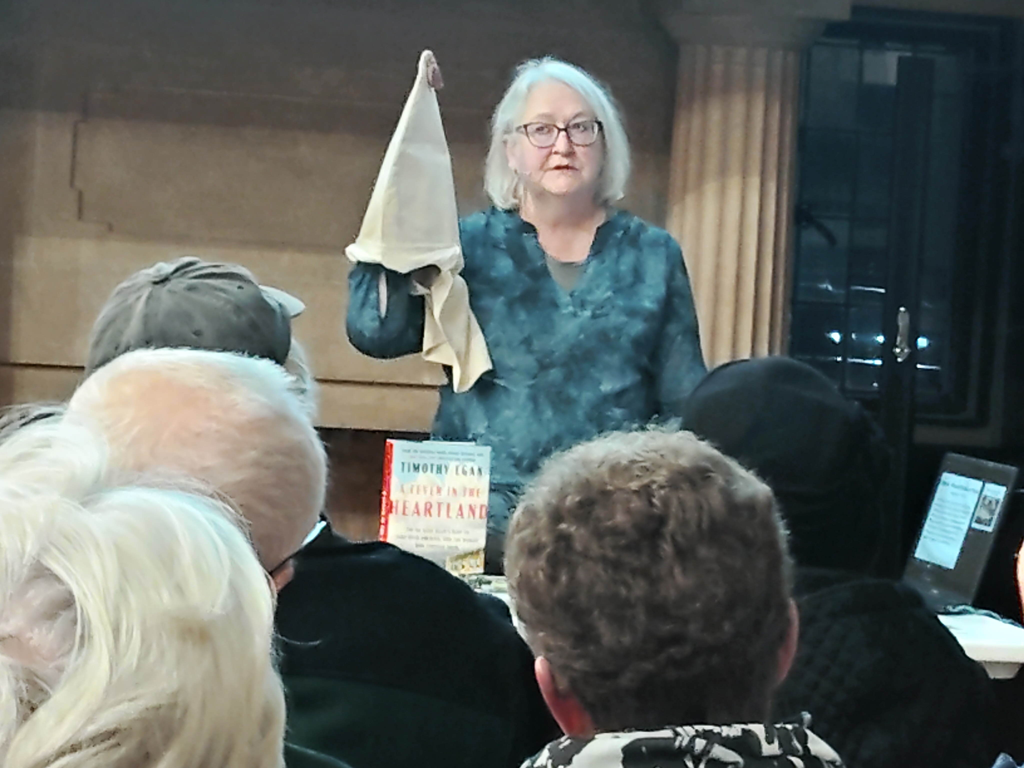Nancy Vaillancourt displays an authentic Klan hood given to her by a woman from Blooming Prairie. She warned audience members that some items she would be showing may be disturbing and that they could step out if necessary. (Minnesota Prairie Roots copyrighted photo February 2025)