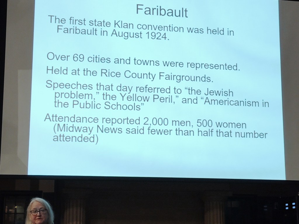 Faribault hosted the first state Klan convention, with details outlined in this slide presented by Nancy Vaillancourt. (Minnesota Prairie Roots copyrighted photo February 2025)