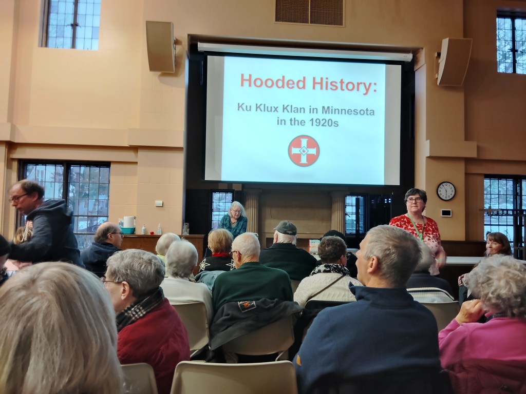 Because Vaillancourt is from Owatonna, much of her talk focused on that community just south of Faribault along Interstate 35. Owatonna, it seems, was a hotbed of Klan activity, hosting local and state gatherings. But the fact that stood out for me was the Klan’s purchase of 20 acres of land east of downtown Owatonna. That land became Klan Park, a place to gather, organize and socialize. The local chapter even constructed a meeting house there. While it is disheartening to hear this, it was uplifting to learn that the land was sold in 1945—to a man whose wife was Catholic. Attendee Bonnie shared that bit of information about her great uncle, who was invited to join the Klan, declined because of his wife’s Catholicism and then eventually bought the land. Today that former KKK park is the site of soccer practice fields, Vaillancourt noted, where a diverse group of youth play.