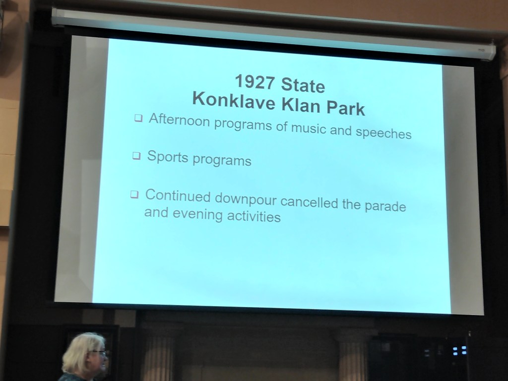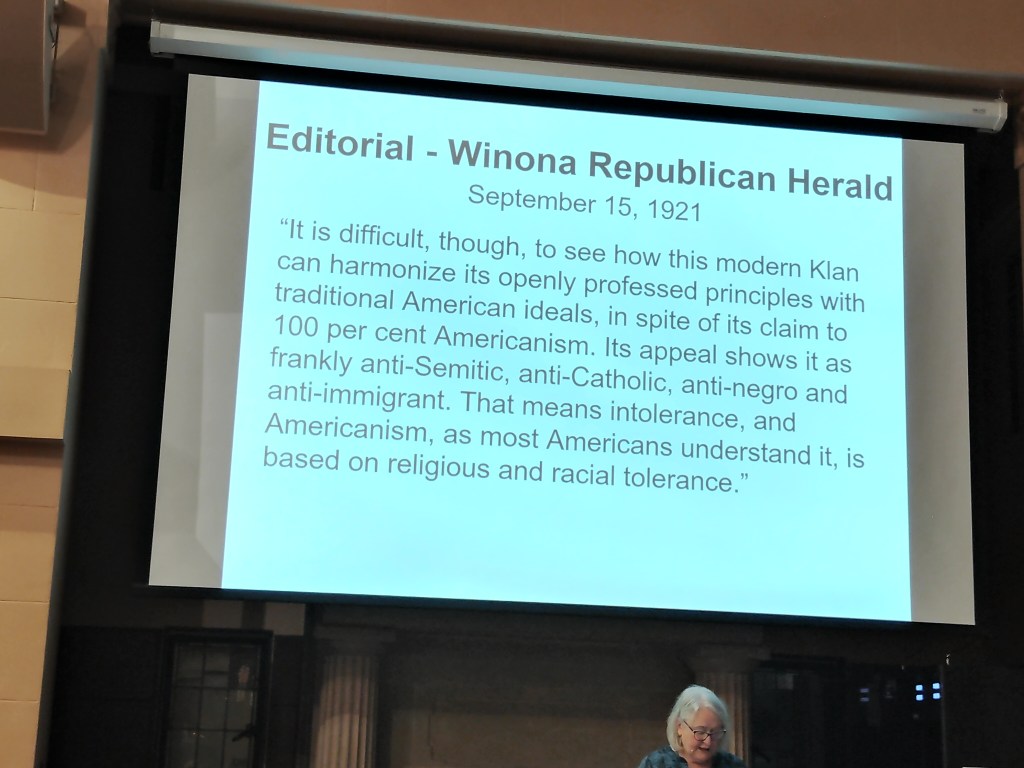 Vaillancourt covered a whole lot more in her presentation. Like how the Klan recruited from fraternal orders, Protestant churches, via fiery speeches, by invitation. Fear and social and economic pressure were used to draw people into the Klan. Sound familiar? In Virginia, in northern Minnesota, the entire school board claimed Klan membership and made Bible reading in school compulsory. The mayor of St. James was a major grand dragon of the KKK. The Northfield Klan hosted a KKK homecoming Labor Day parade in September 1926. The Klan was big on parades. That makes sense given the intimidation and fear a mass of hooded marchers can instill in the public. And Owatonna residents were afraid, Vaillancourt said.